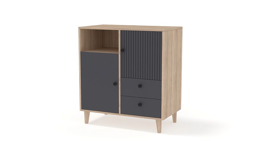Комод Брукс 2 BMS позволит вам убрать множество мелочей, а необходимые вещи держать под рукой. Две распашные секции с полками, два ящика и ниша располагаются компактно, экономя пространство. Графичные линии фасада, украшенного рельефом и оснащенного круглыми ручками, красиво контрастируют с теплотой древесной отделки корпуса и ножками. Купить комод Брукс 2 BMS вы сможете недорого в нашем интернет-магазине, изменив по желанию размеры и цветовую гамму.