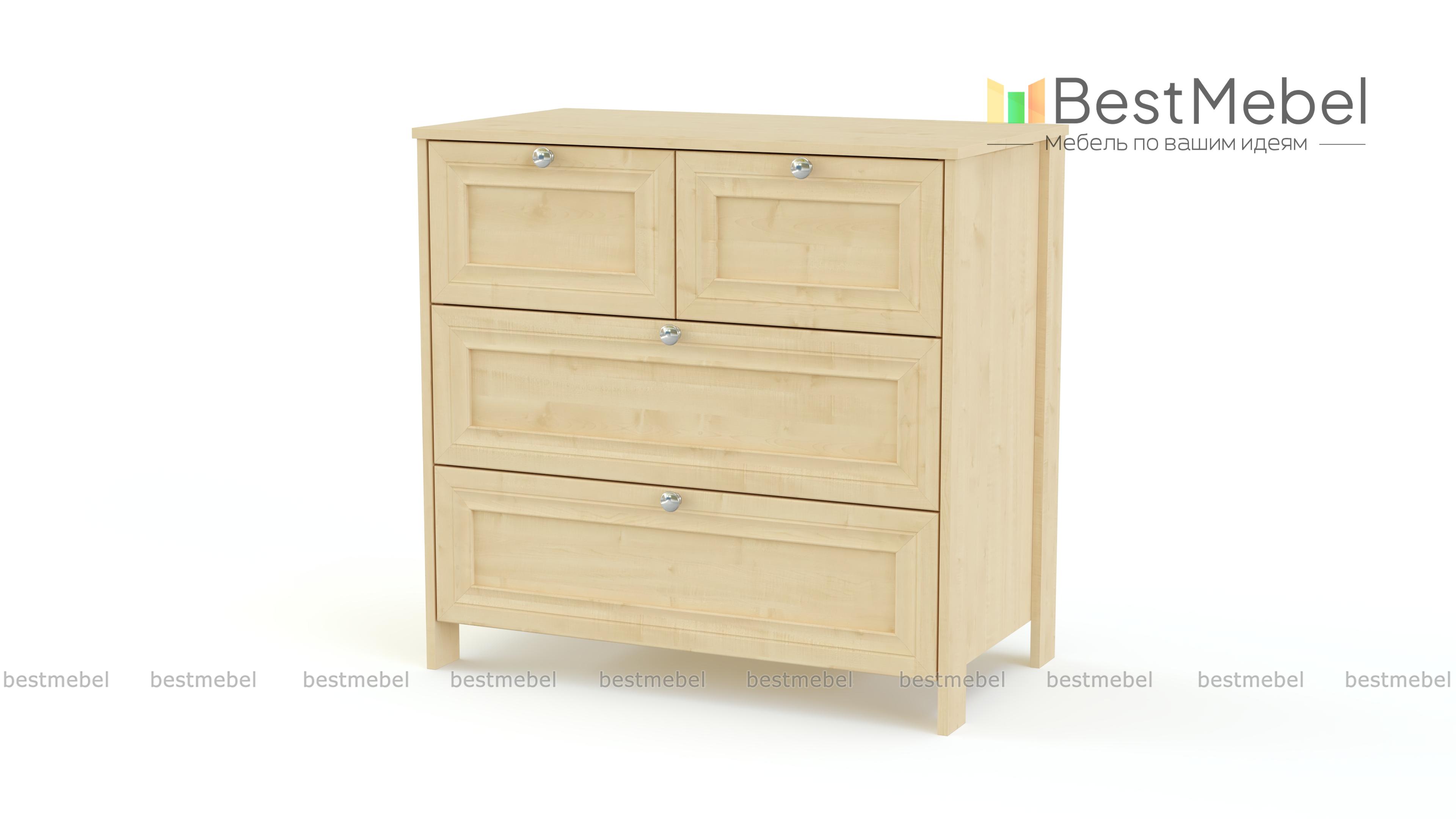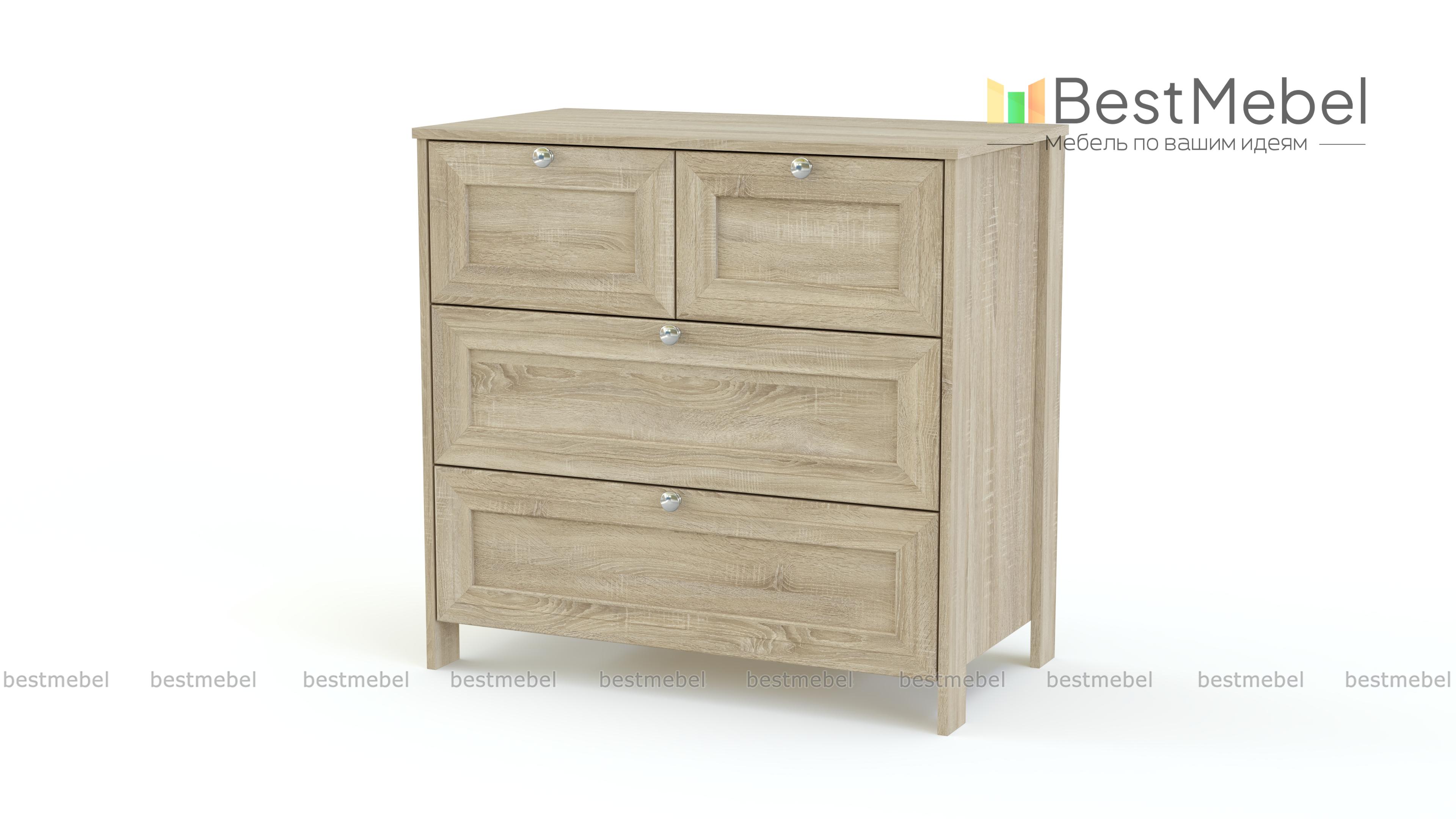 Комод Соната BMS станет изящным дополнением спальни в стиле прованс или классическом. Комод на высоких ножках выполнен в светлых древесных тонах и декорирован изящной рамкой. Вы сможете эффектно разместить на столешнице декоративные предметы, а для хранения бытовых мелочей, одежды и домашнего текстиля конструкцией предусмотрены два малых и два больших выдвижных ящика с ручками-кнопками. Купить комод Соната BMS приглашаем к нам в интернет-магазин.