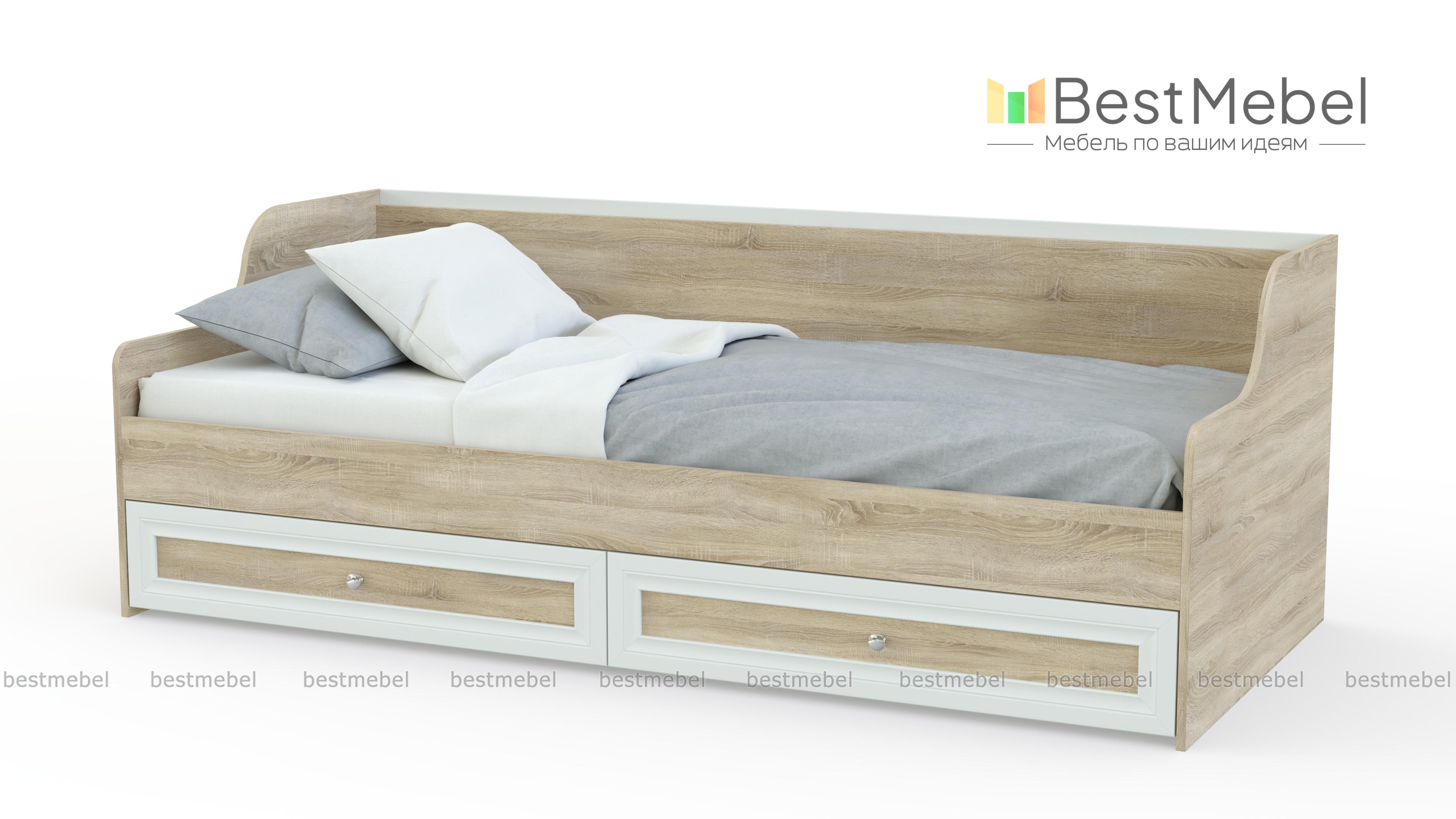 Детская кровать Твинс-1 BMS – практичное решение для спальни ребенка. Эстетичный внешний облик, комфортная конструкция, напоминающая диван. Есть спинка, небольшие подлокотники-боковины. Основание постели – ламелевое, что является преимуществом модели, оно усиливает ортопедические свойства матраса. В результате поверхность спального места всегда будет ровной и упругой. Система хранения реализована с помощью выдвижных ящиков. Их объем позволяет разместить там объемные одеяла, плед, текстиль.