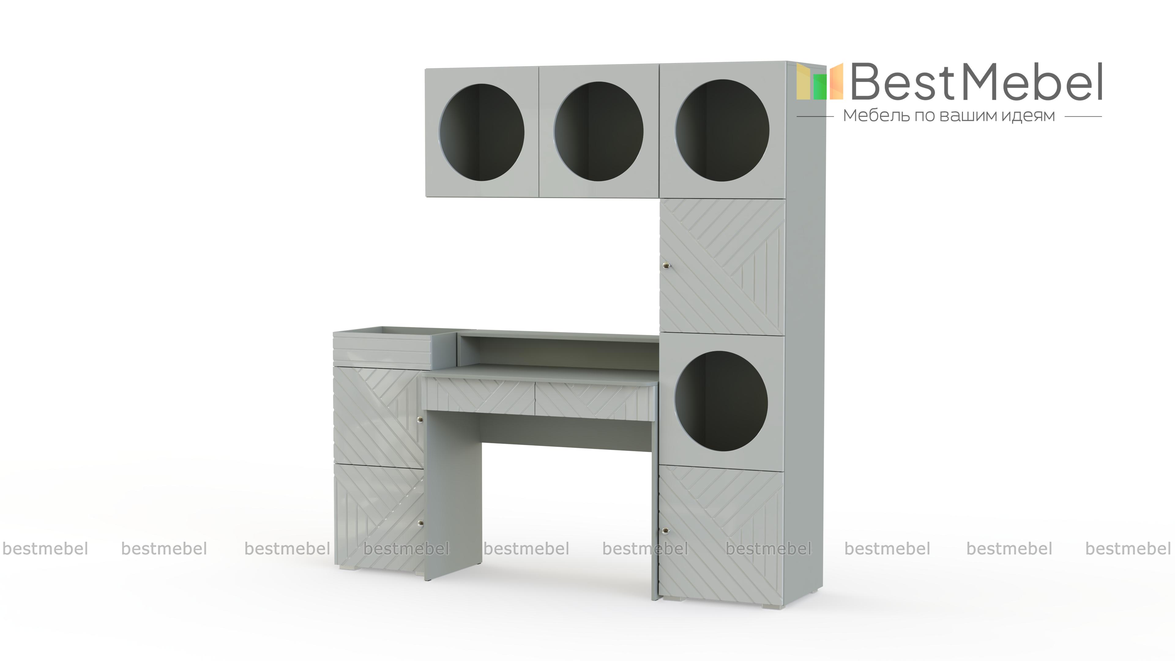 Детская стенка Авелин 8 BMS — яркая и функциональная, поможет вам создать пространство для учебы. Столик с ящиками и надстройкой дополняет вместительная приставная тумба, а продолжением шкафа-пенала станет навесная полка с оригинальными круглыми вырезами. Цветные фасады с разным направлением фрезеровки добавят красок в спокойную обстановку детской. Купить детскую стенку Авелин 8 BMS приглашаем к нам в интернет-магазин, по желанию изменив цвет и размеры.
