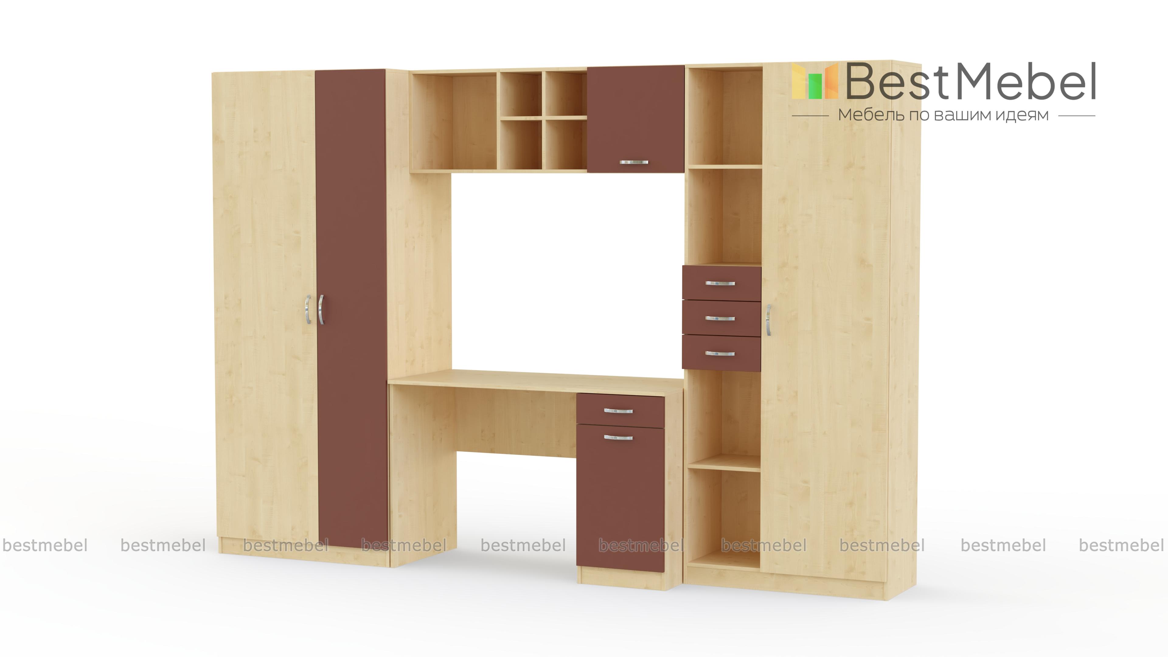 Вместительная и функциональная детская стенка Симба Композиция 1 BMS решит в комнате ребенка проблемы с размещением рабочего места и хранением самых разнообразных вещей. В комплект входят письменный стол с тумбой, комбинированный стеллаж, навесная полка и двухдверный одежный шкаф. Книги, игрушки, школьные принадлежности и предметы гардероба всегда будут в порядке и под рукой. Не оставит равнодушными детей и взрослых и яркая, контрастная расцветка фасадов.