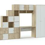Свое название симпатичная детская стенка Тетрис № 14 BMS получила благодаря оригинальному оформлению квадратами и расположению лесенкой входящих в комплект стеллажей. Для успешной учебы и аккуратного размещения вещей ребенка стенка оборудована письменным столом, навесной полкой, трехстворчатым вместительным шкафом и комбинированными стеллажами. Максимально удобная система хранения позволит без труда расположить все необходимые принадлежности, предметы гардероба и любимые игрушки.