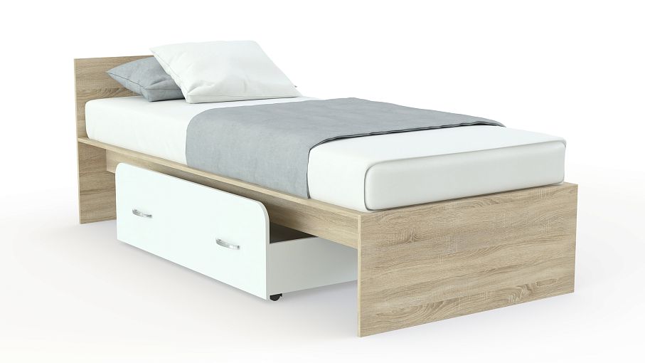 Кровать детская Чемпион с ящиком BMS – универсальное решение для интерьера современной детской. Модель выполнена из экологичных материалов в сочетании светлых древесных оттенков и белого цвета, отличается лаконичным дизайном и надежностью конструкции. Просторное за счет отсутствия спинки в изножье спальное место дополнено изголовьем средней высоты. Для удобного хранения постельных принадлежностей предусмотрен выдвижной ящик со скругленным фасадом. Купить кровать детскую Чемпион с ящиком BMS приглашаем в наш интернет-магазин.