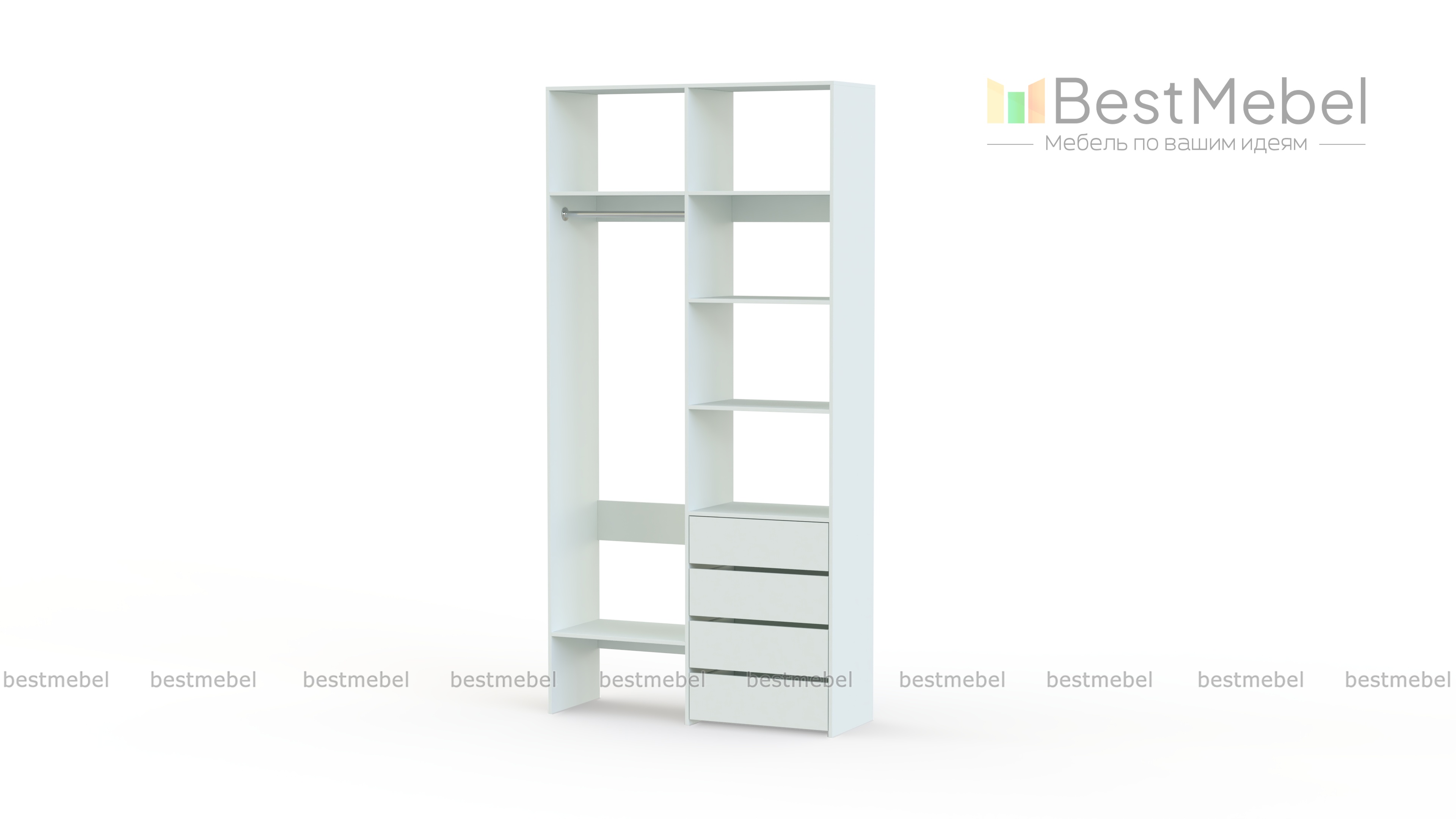Стеллаж для одежды Мирта 2 BMS поможет вам организовать хранение дома или в торговом зале. Открытая конструкция со штангой, полками и рядом из четырех выдвижных ящиков подходит для размещения одежды на вешалках, коробок с обувью и мелкого трикотажа. Материал изготовления – устойчивая к износу и долговечная ламинированная плита в базовом оттенке.