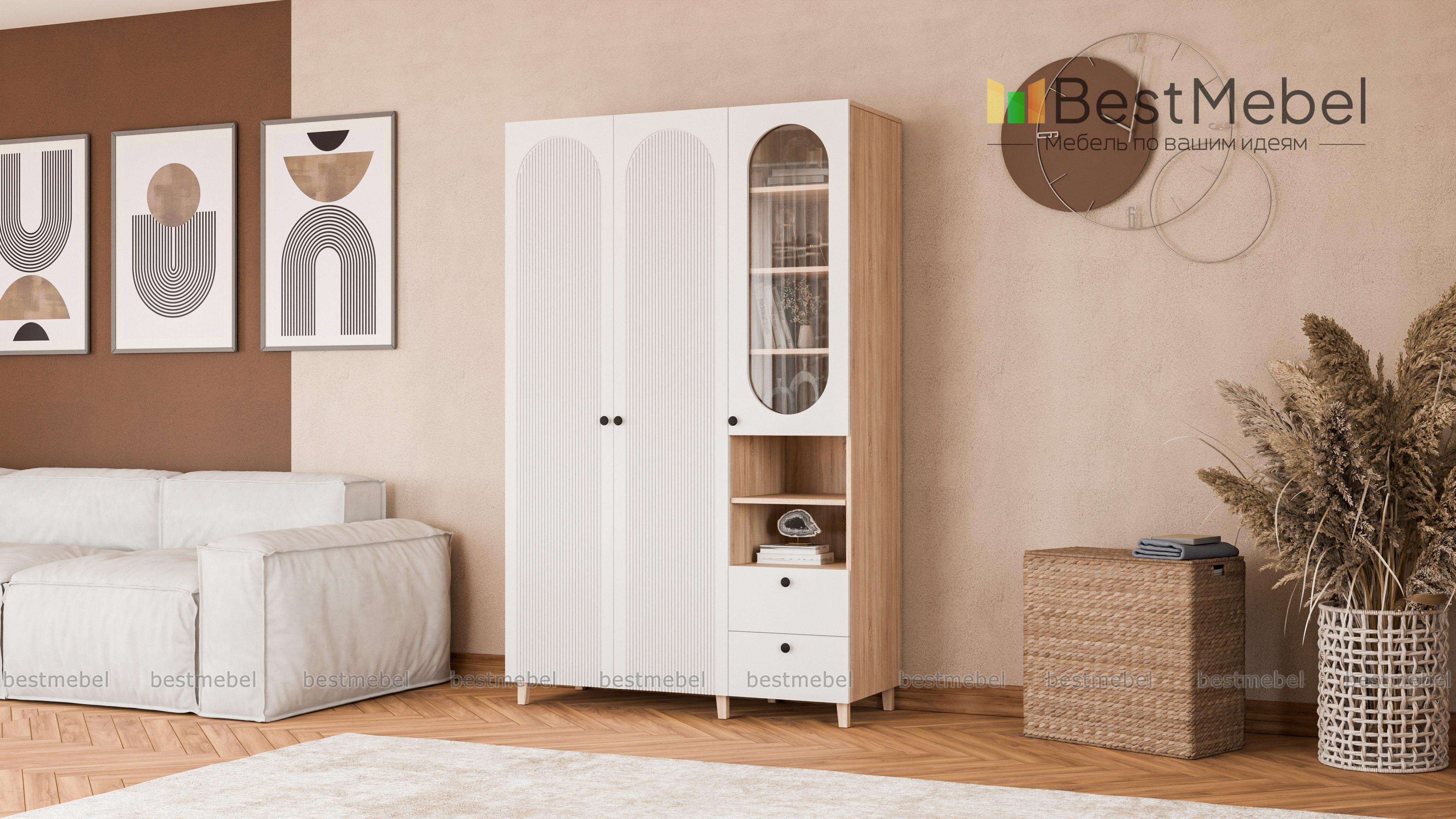 Шкаф распашной Рене 12 BMS обеспечит разные варианты хранения благодаря функциональной конструкции. Слева располагается одежная штанга за распашными дверцами, а справа — застекленные полки, ниши и пара выдвижных ящиков. Высокие ножки добавляют этой элегантной фрезерованной модели в светлом оформлении легкости и «воздушности». Купить шкаф распашной Рене 12 BMS вы сможете недорого на сайте нашего интернет-магазина, подобрав размеры, цвет и фурнитуру.