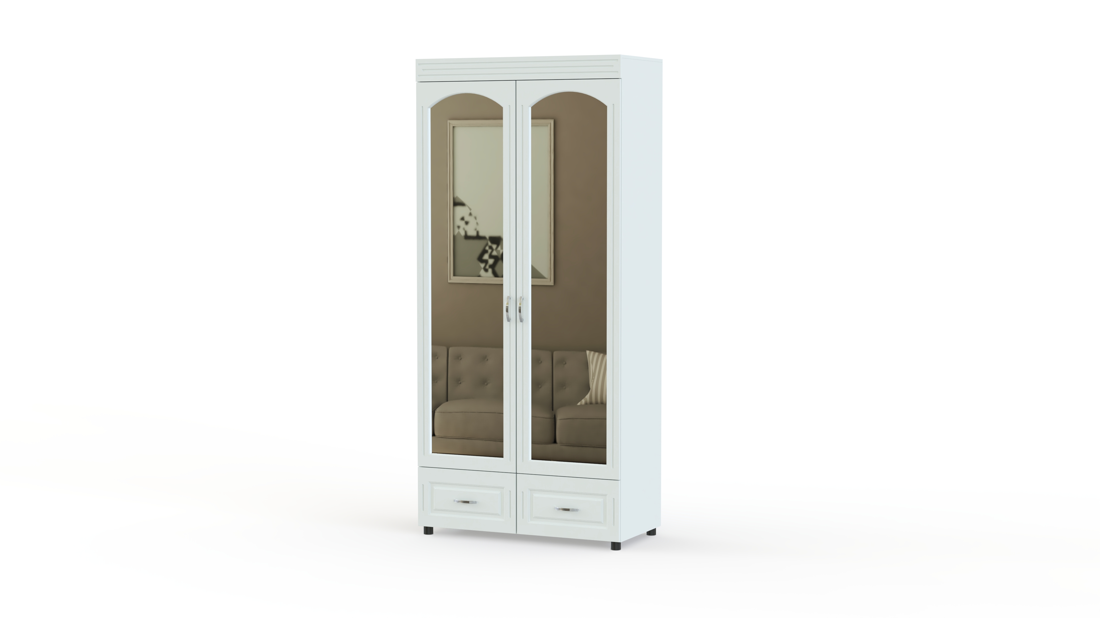 Элегантный классический комплект для спальни Элизабет Композиция 3 BMS, выполненный в светлых тонах, выглядит особенно легко и атмосферно и станет в интерьере вашего дома стильным акцентом. В гарнитур входят платяной шкаф с изящными полукруглыми зеркалами, туалетный столик с навесным широким зеркалом, удобная двуспальная кровать и две прикроватные тумбы. Фасады мебели декорированы металлическими, под позолоту, оригинальными ручками, придающими всему комплекту винтажный оттенок.