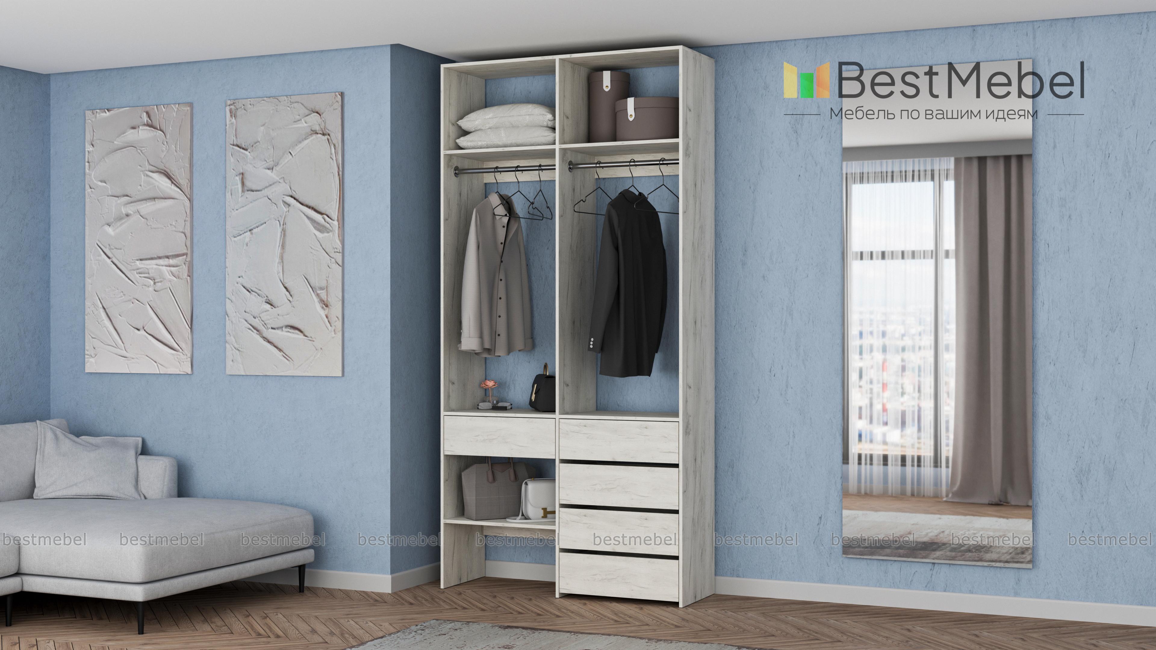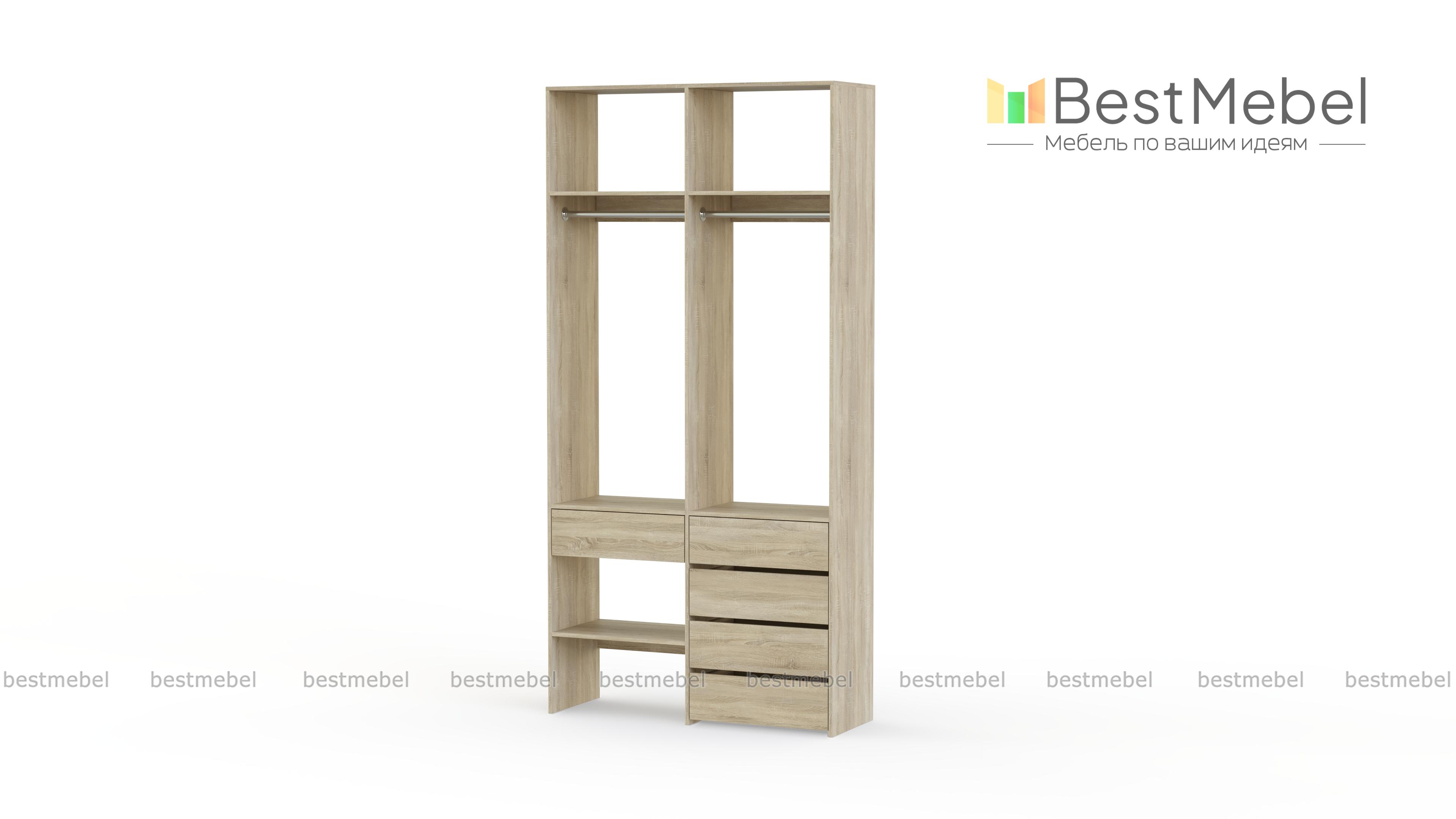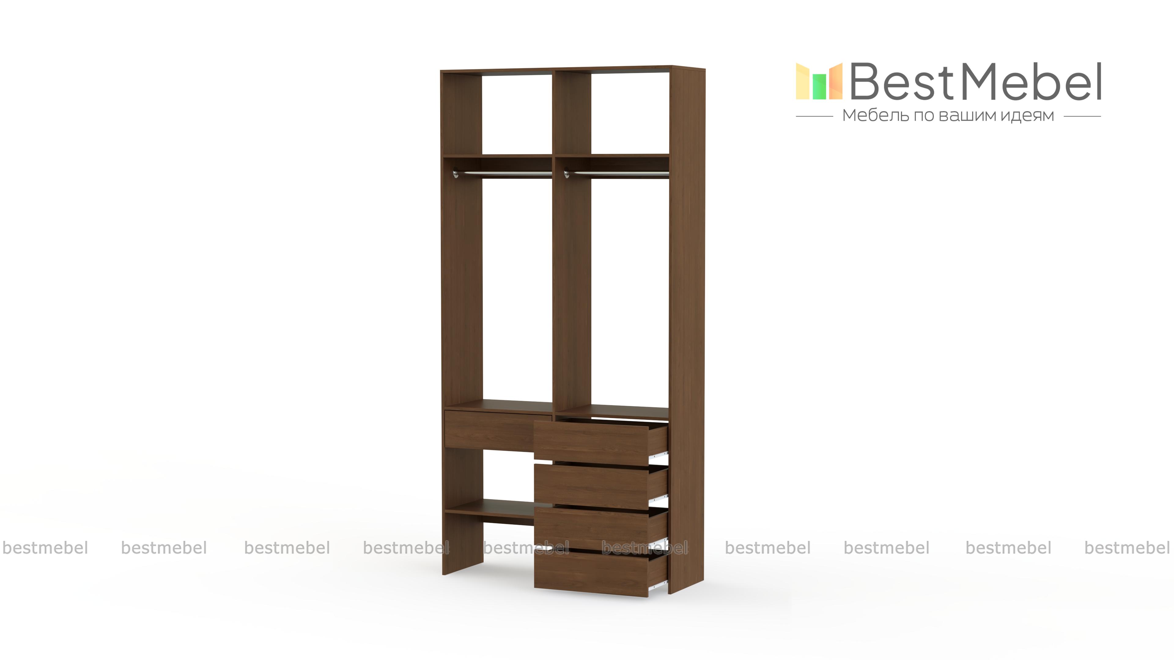 Стеллаж для одежды Мирта 46 BMS — стильный и функциональный, имеет удобную конфигурацию. Две штанги, полки на разной высоте и пять выдвижных ящиков максимально эффективно используют небольшое пространство. Двухсекционный стеллаж из прочной ламинированной ДСП прекрасно подходит для малогабаритных помещений, легко сохраняя порядок. Купить стеллаж для одежды Мирта 46 BMS в необходимом размере и любом оттенке из нашего каталога вы сможете на сайте интернет-магазина.