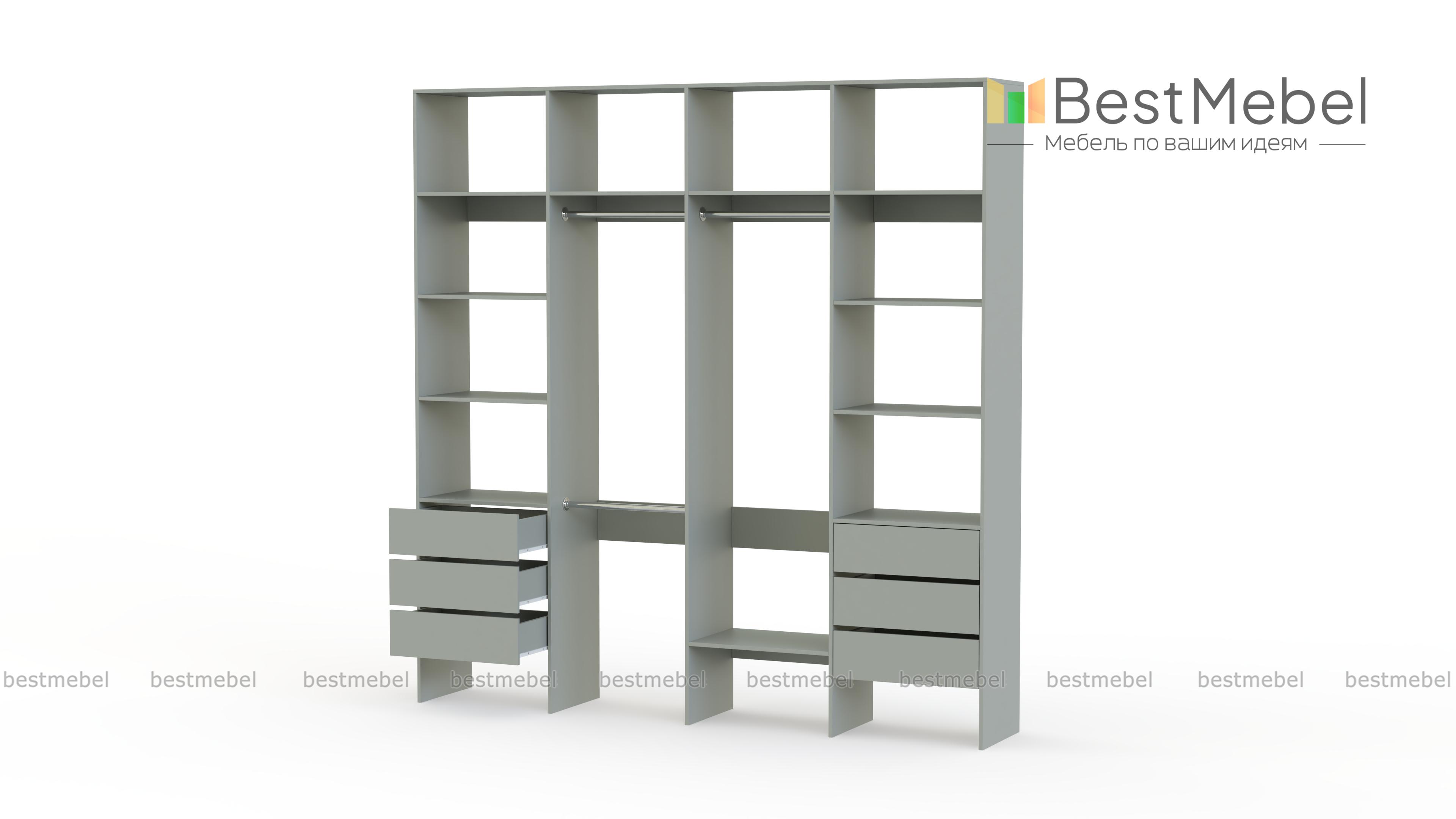 Стеллаж для одежды Мирта 65 BMS поможет легко сохранить порядок в гардеробной и входной зоне. Для компактного и аккуратного размещения вещей в стеллаже предусмотрены штанги, расположенные на двух уровнях, боковые и верхние полки, а также два ряда выдвижных ящиков. Качественная ламинированная ДСП гарантирует простоту ухода и долгий срок службы. Купить стеллаж для одежды Мирта 65 BMS, изготовленный по индивидуальным размерам, можно на сайте нашего интернет-магазина.