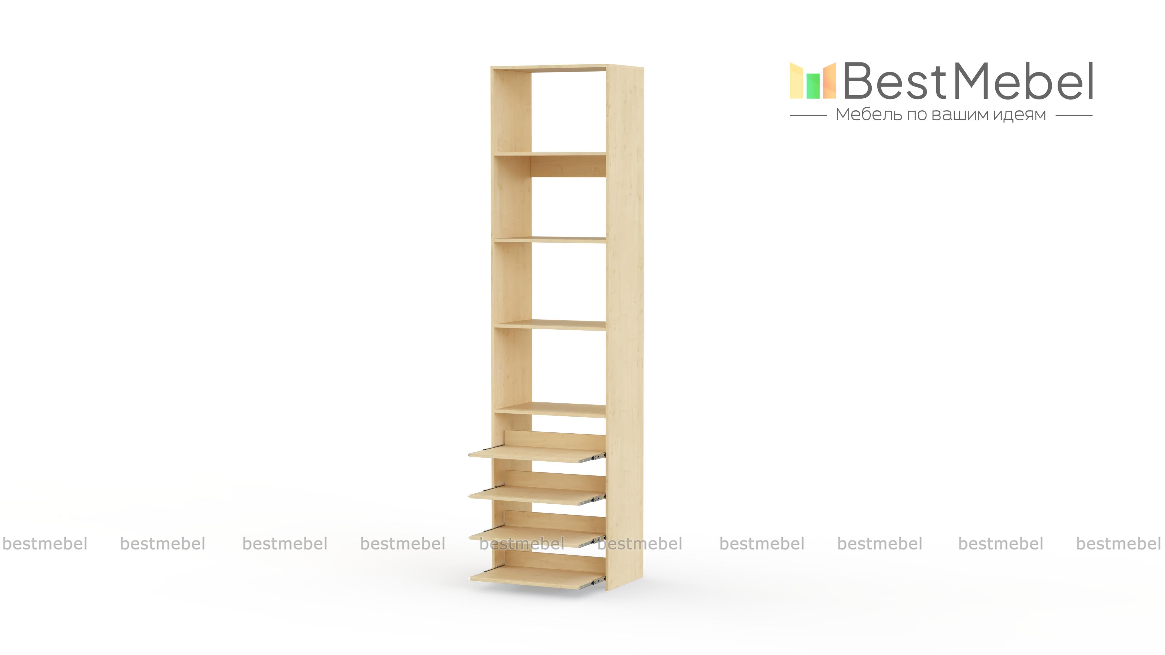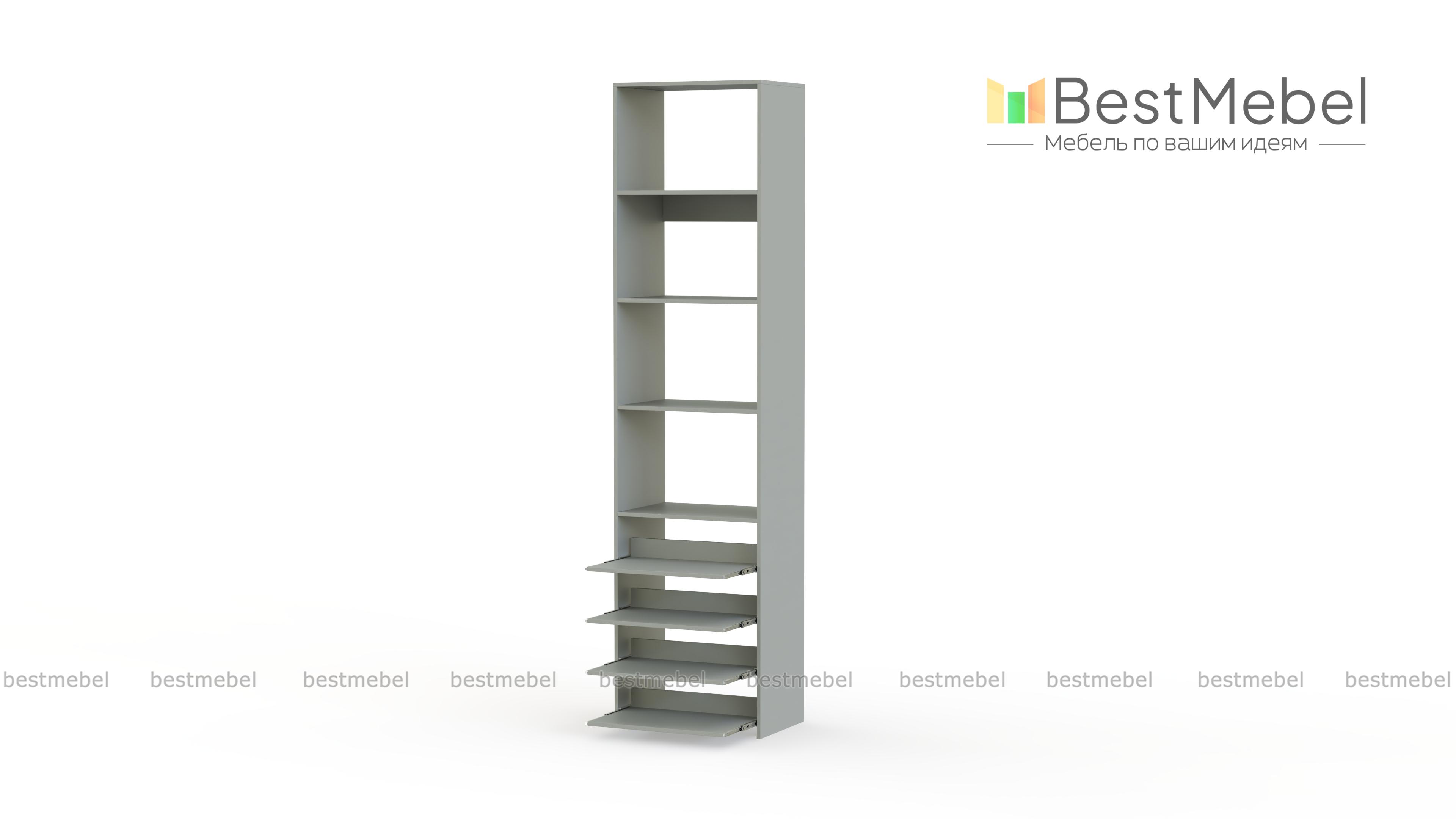 Стеллаж для одежды Мирта 74 BMS прекрасно подходит для небольшого количества вещей. В узком стеллаже, оснащенном четырьмя стандартными и четырьмя выдвижными полками можно хранить сложенную одежду, сезонную обувь и всевозможные аксессуары. Открытая конструкция обеспечивает удобный доступ к содержимому полок и упрощает уборку. Купить стеллаж для одежды Мирта 74 BMS, изготовленный по индивидуальным размерам, можно недорого на сайте нашего интернет-магазина.