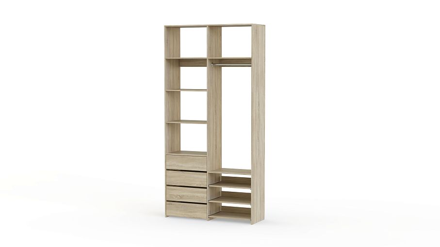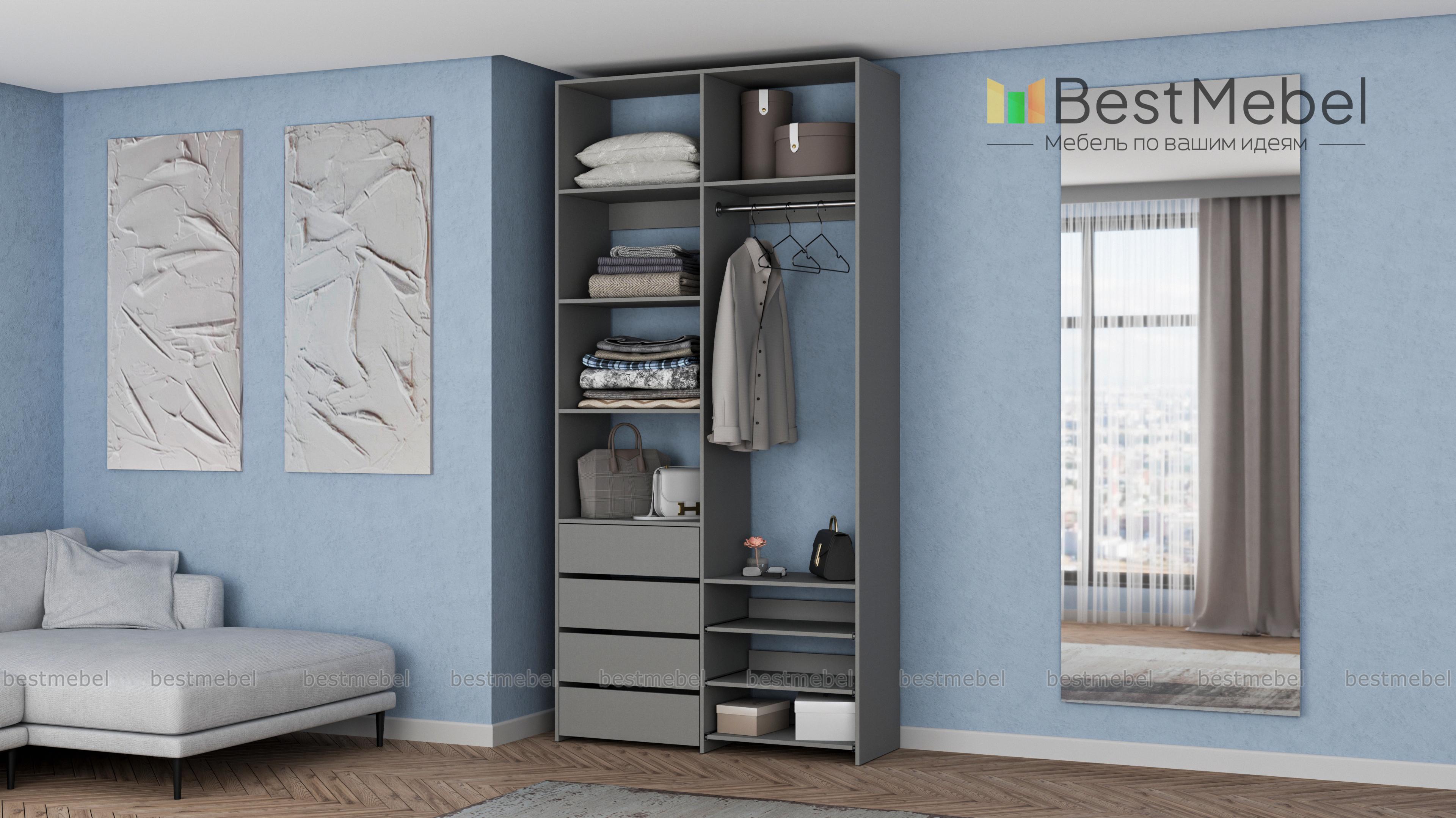 Стеллаж для одежды Мирта 87 BMS оптимален для небольших пространств. Штанга, выдвижные полки и ящики, а также пять просторных бельевых секций обеспечивают достаточно места для хранения базового гардероба. Простой и функциональный дизайн в сочетании с широкой цветовой гаммой позволяют легко комбинировать стеллаж с другой мебелью. Купить стеллаж для одежды Мирта 87 BMS с изготовлением по индивидуальным размерам вы сможете недорого в нашем интернет-магазине.