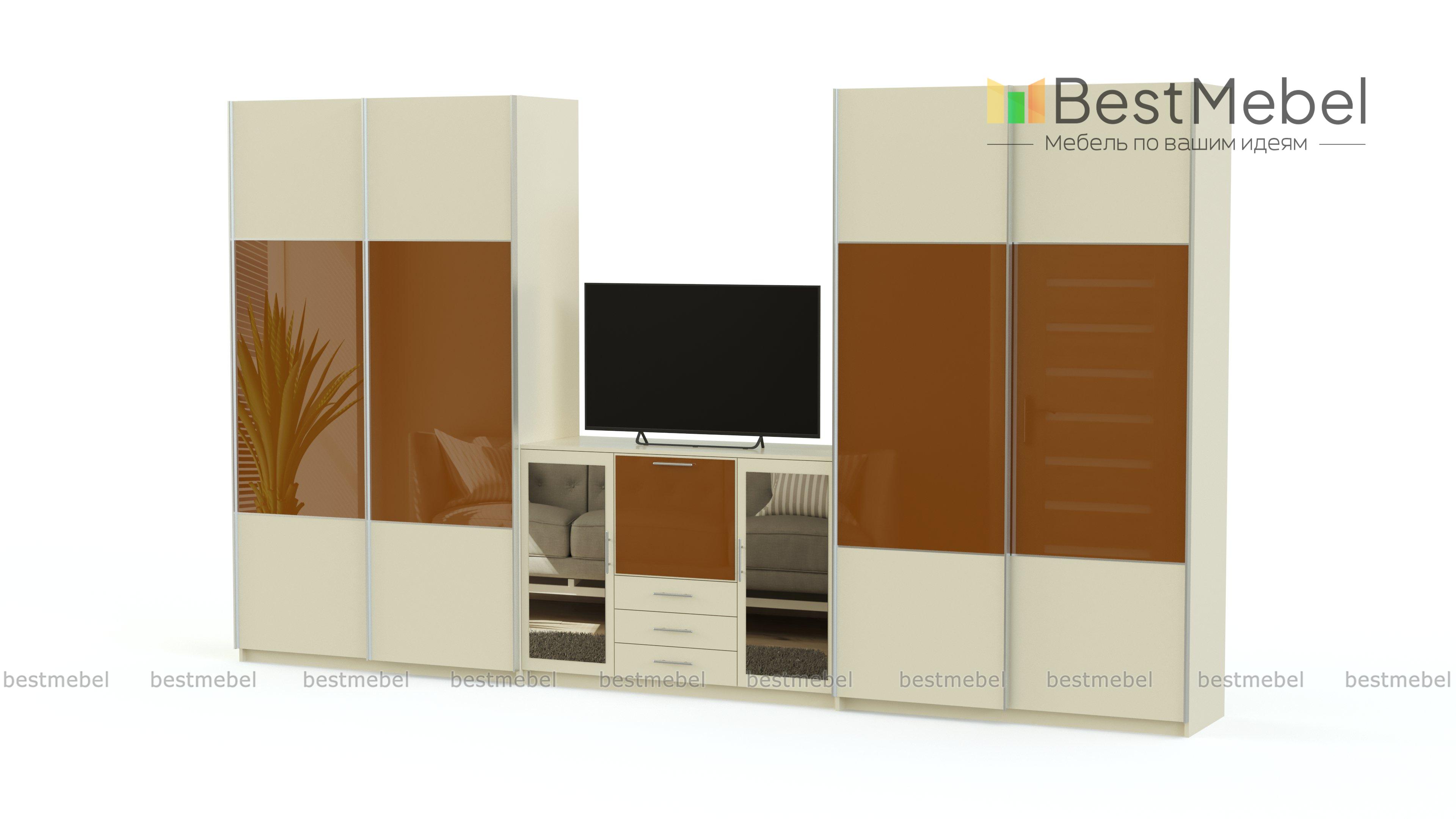 Гостиная Квадро BMS полностью занимает одну из стен комнаты и максимально эффективно использует доступное пространство. В комплект входят два симметрично расположенных шкафа-купе и тумба под ТВ в центральной части. Вы сможете легко разместить не только аппаратуру, посуду и декоративные предметы, но и одежду, домашний текстиль и множество бытовых мелочей, разгрузив другие помещения дома. Украшением интерьера станут фасады, сочетающие зеркала и поверхности с имитацией текстуры дерева. Купить гостиную Квадро BMS приглашаем в наш интернет-магазин.