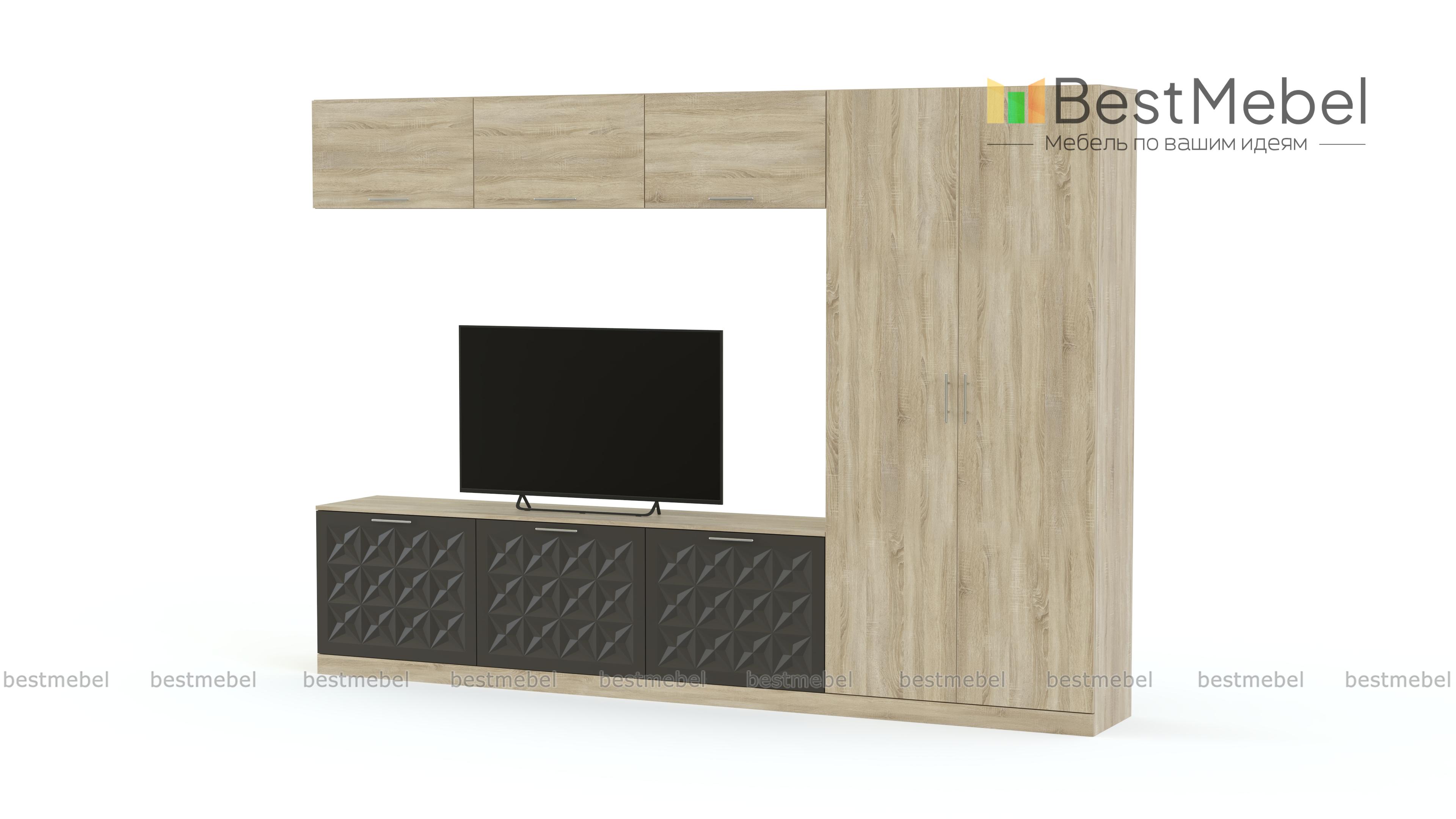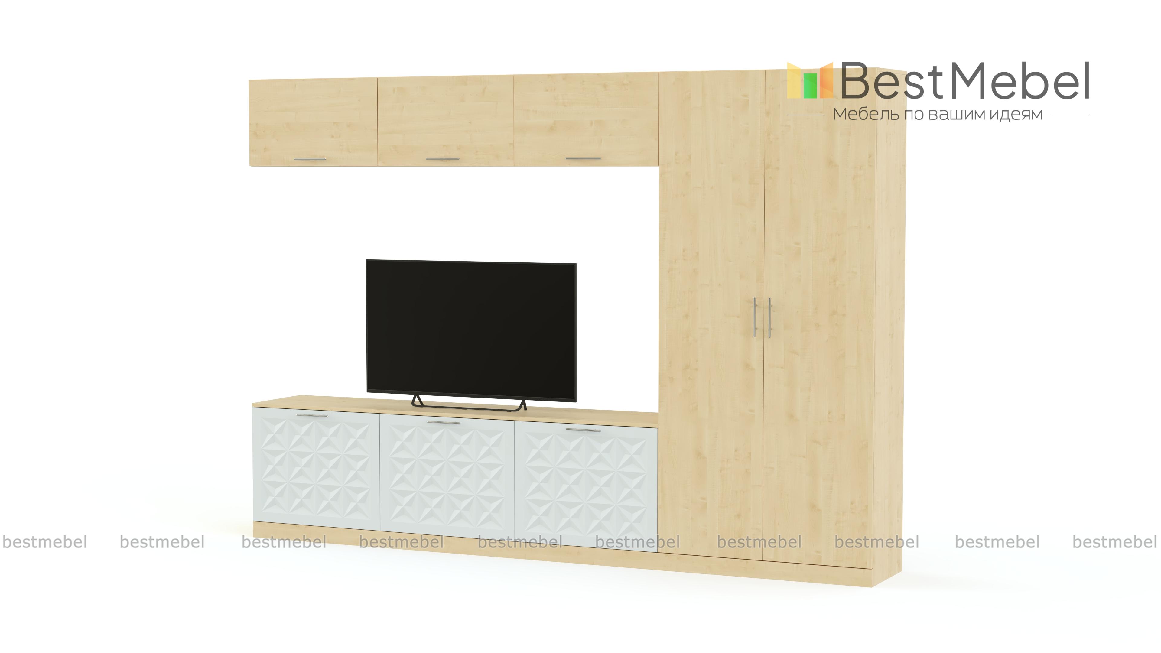 Стенка Вельвет 7 BMS понравится тем, кто предпочитает лаконичные формы и функциональность современного стиля. Простой по форме, комплект поможет эффектно оформить зону ТВ и разместить одежду, предметы декора и многое другое. Модель оборудована широкой низкой тумбой под ТВ, навесными секциями с откидными дверцами и платяным шкафом. Яркий оттенок фасадов с рельефным рисунком интересно сочетается с теплыми древесными тонами. Купить стенку Вельвет 7 BMS недорого приглашаем в наш интернет-магазин.