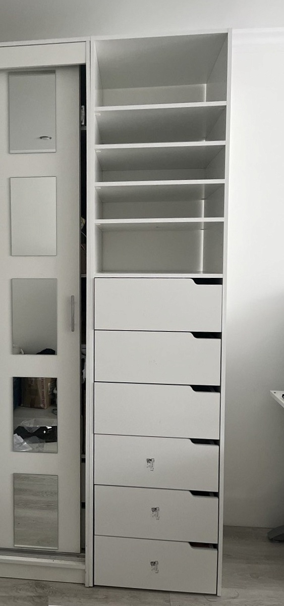 Заказ 00000341133. Люблю эту компанию за то, что все можно добавить и заказать по своим размерам, брала лет 5 назад у них шкафы, отличные, стоят как новенькие. В январе 2025 заказала Стеллаж для одежды Мирта 37 BMS с дополнениями которые мне были нужны, в этот раз как и в прошлый заказала ящики с ДСП дном, они очень хорошо себя показали, прочные удобные, не беспокоюсь, что дно прогнется или тяжелое нельзя класть. У меня кот Мэйн-кун 8 кг. Часто лежит в выдвижном ящике, в котором хранятся его лакомства. По прошлым заказам поняла, что все качественное, не стала заказывать суперпрочную кромку, да и вообще то что мне было моей целью оставила по умолчанию в базовом варианте и всё как в прежние годы великолепно. Привезли и подняли, занесли в квартиру без всяких уговоров, быстро вежливо! Сборщик приехал в удобное для нас время, собрал при нас, быстро и качественно!!!
