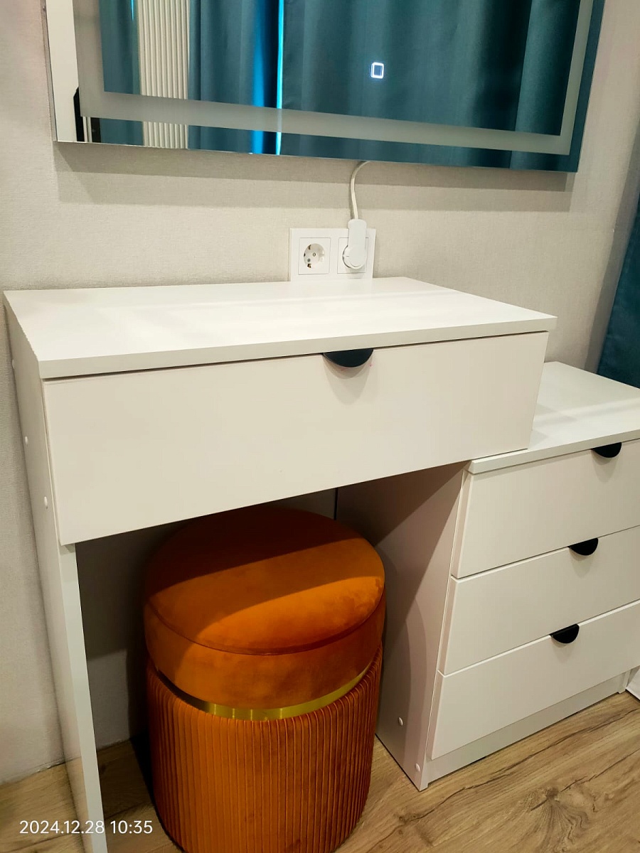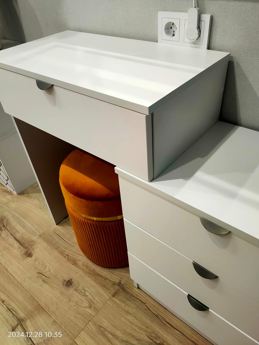 Заказ 00000874124 Стол туалетный Катерина-6, в общем все понравилось, немного не угадали с ручками, на сайте показалось что они черные, а оказалось темный металл. и они очень плотно прилегают к корпусу, тормозят открывание немного. оказался по размерам очень компактным, думали будет немного вместительнее. в общем и целом качество хорошее. понравилось, что на сайте можно все под себя подобрать, вроде стандартно, но индивидуально, это очень удобно. спасибо.
