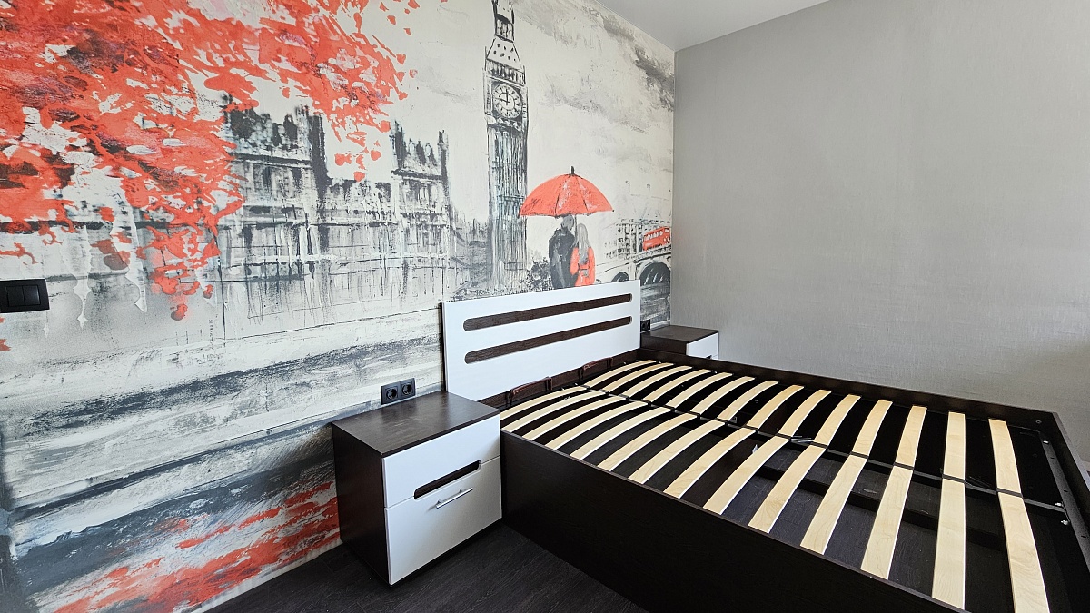 Стенка смотрится очень современно, идеально сочетается с кроватью и тумбами из этой же серии. Хотелось бы повыше шкафы и открывающуюся дверку под тв-тумбой, иначе пропадает место.