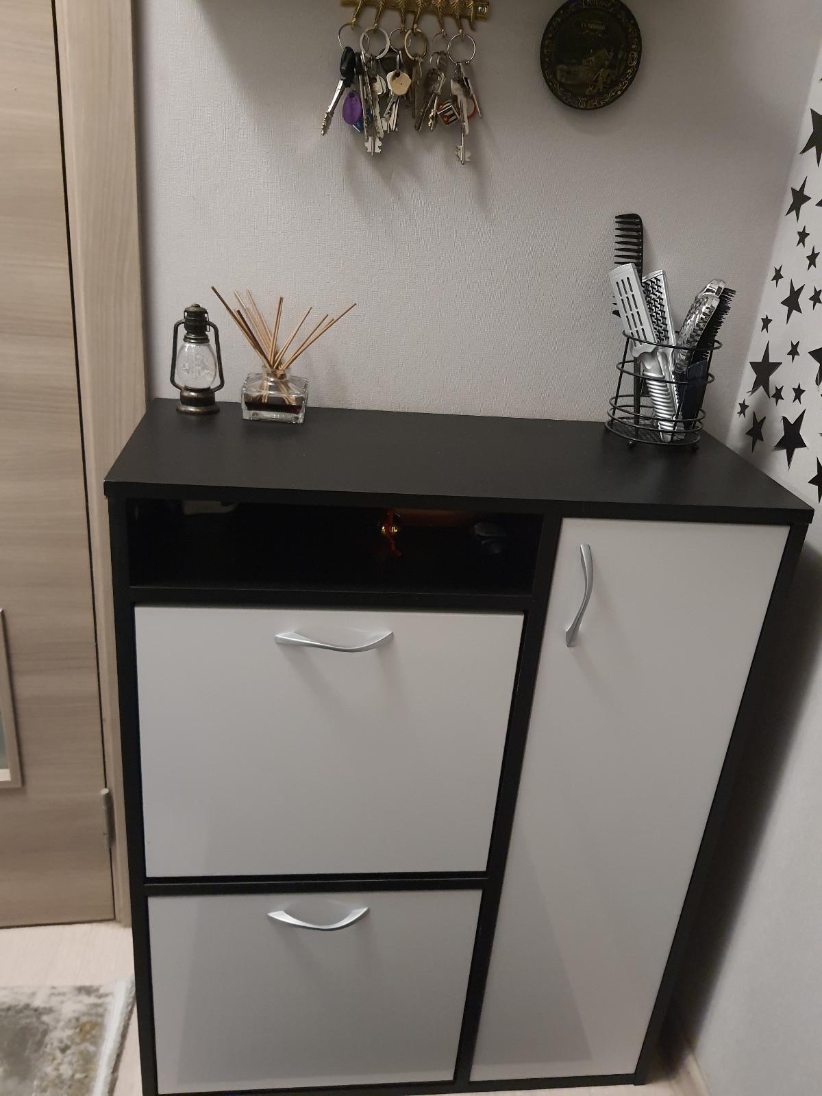 Купила в узкий коридор. Переживала, что займет много места, благо можно выбрать любой цвет и размер!- это очень важно для малогабаритных квартир! Выбрала белый фасад в сочетании с черным, зрительно совсем не забирает пространство! Ящики глубокие, много чего можно туда разместить. Комод функциональный!