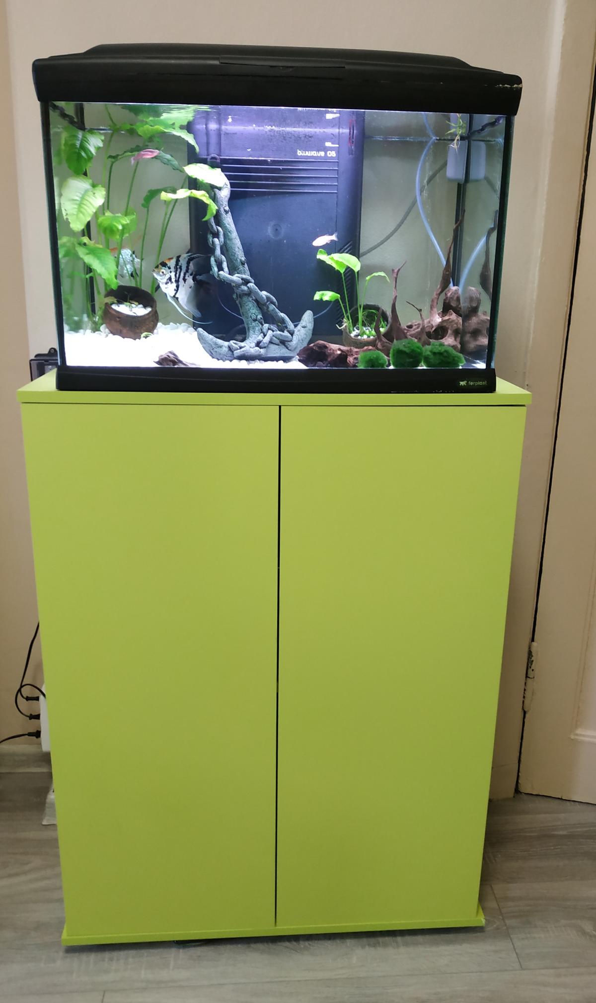 Замечательная тумба! У нас в комнате несколько салатовых акцентов, искали аквариумную тумбу, которая бы хорошо вписывалась. Изначально хотели белую, т.к.  вся мебель белого цвета, но вошли в коныигуратор и приятно удивились, узнав, что можно и размер, и цвет подобрать, поэтому не стали скромничать и заказали салатовую тумбу. Заказ 00000635702, изделие ЭСКИЗ №00000635702 Тумба под аквариум Opti 22.5 BMS (740х980х340). Собрали сами. В сборке сложностей не было. Качество материалов хорошее, тумба надёжная. Немного время от времени заедает механизм открывания (открывается нажатием на дверцу), но читала, что этот механизм довольно часто имеет эту проблему. Ещё правая дверца соскакивает, но тут, скорее, наш Если этого не считать, то всё хорошо. Результат можете оценить.