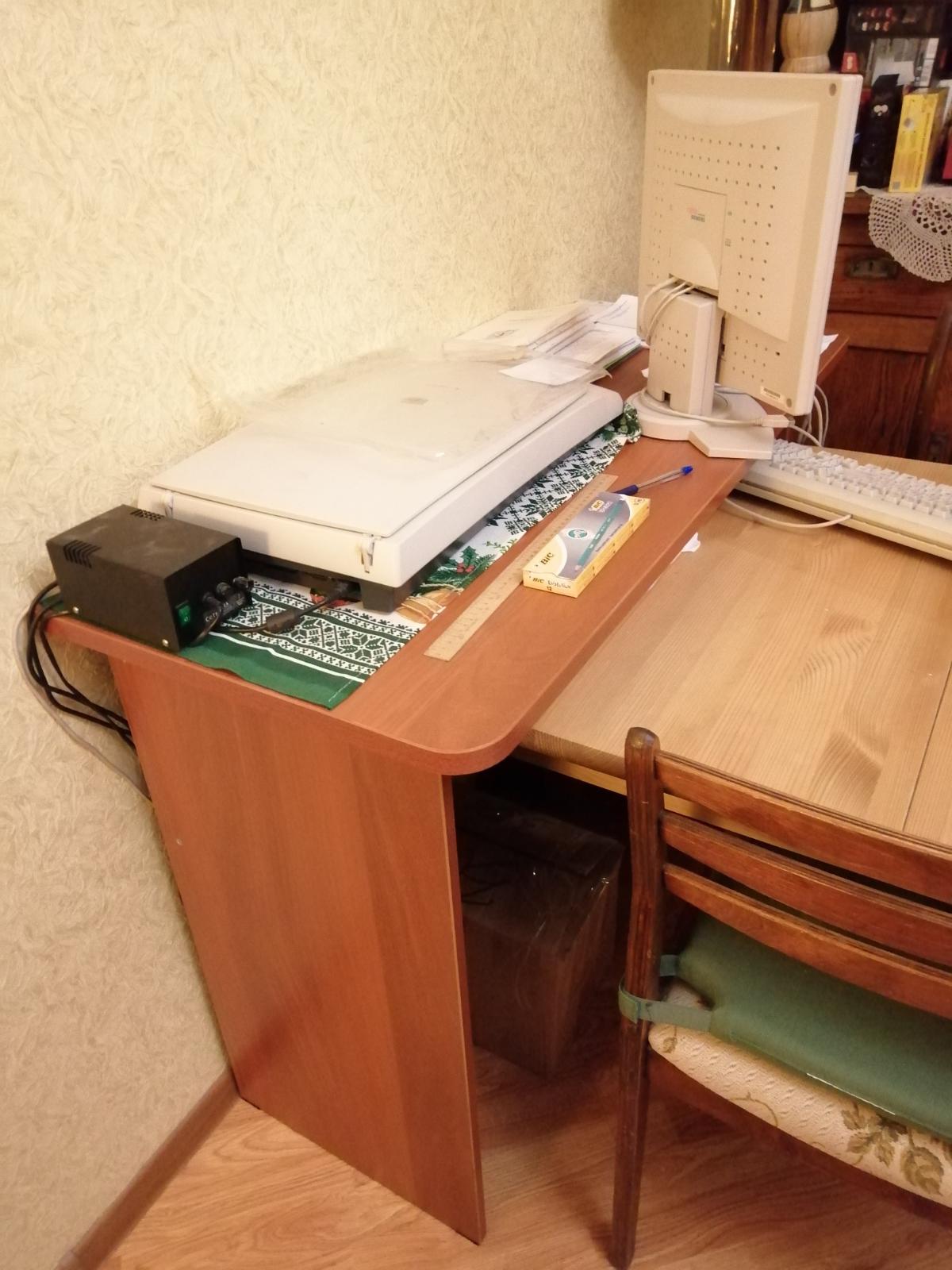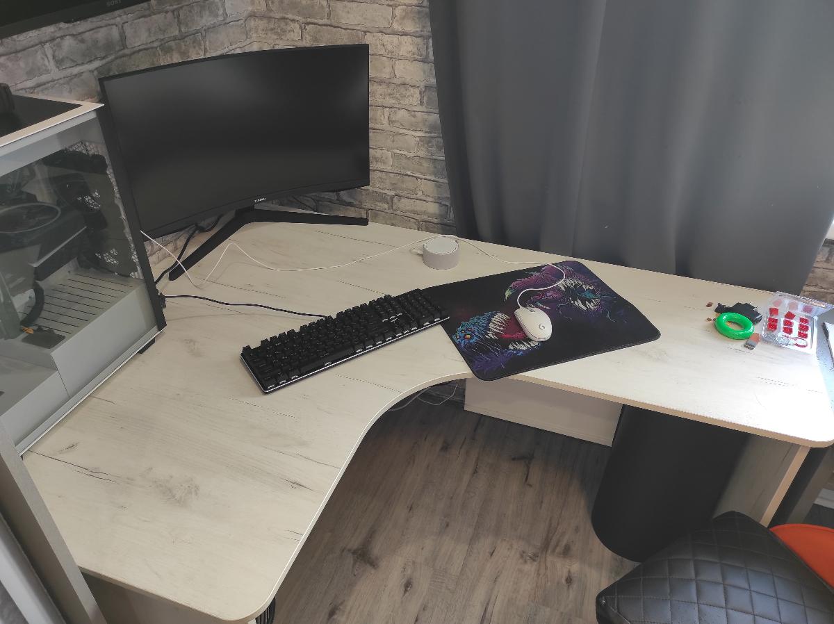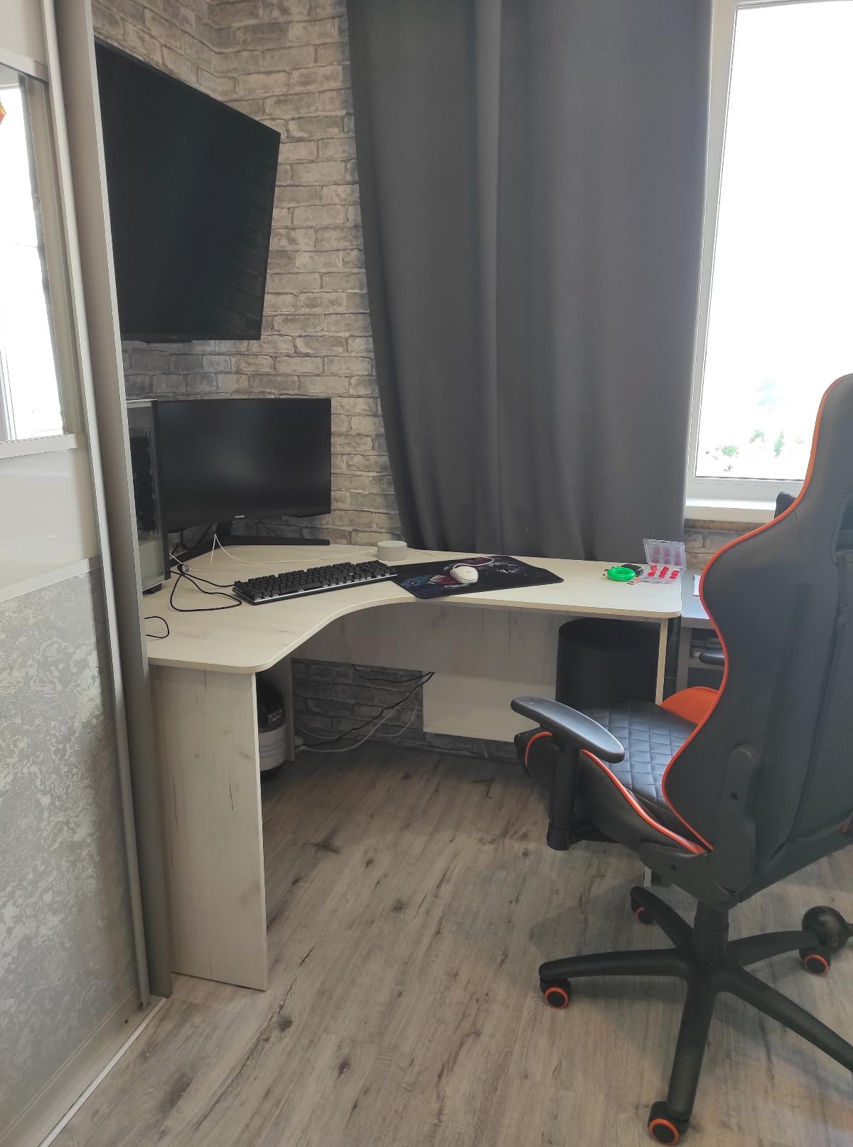 Заказывали этот  стол подростку под компьютер в цвете беленое дерево. Очень довольны тем, что получилось. Получился просто идеальный стол, нарадоваться не можем. Глубокий угол очень удобен под большой монитор - он встает далеко от глаз, зрение не перегружается. Полукруглое место для посадки комфортно - сын туда заезжает на игровом кресле и ничего ему не мешает по бокам.  Углы попросили закруглить и стол получился безопасным и зрительно обтекаемым, громозским не выглядит. А вот  полочку под клавиатуру мы сначала хотели сделать, потом отказались: высоту стола мы не меняли и при ней полка окажется прямо на коленях. Сейчас клавиатура на столешнице и сын говорит - очень удобно: стол угловой - локти не висят.Под столом достаточно места для того, чтобы сделать туда еще и тумбочку. Или даже две - слева большую, а справа  меленькую, неглубокую. Будем дозаказывать. А, да - собирали сами муж с сыном, ничего сложного в сборке нет. А от момента заказа до доставки прошло три дня: в пятницу днем обговорили размеры, в понедельник стол был у нас.