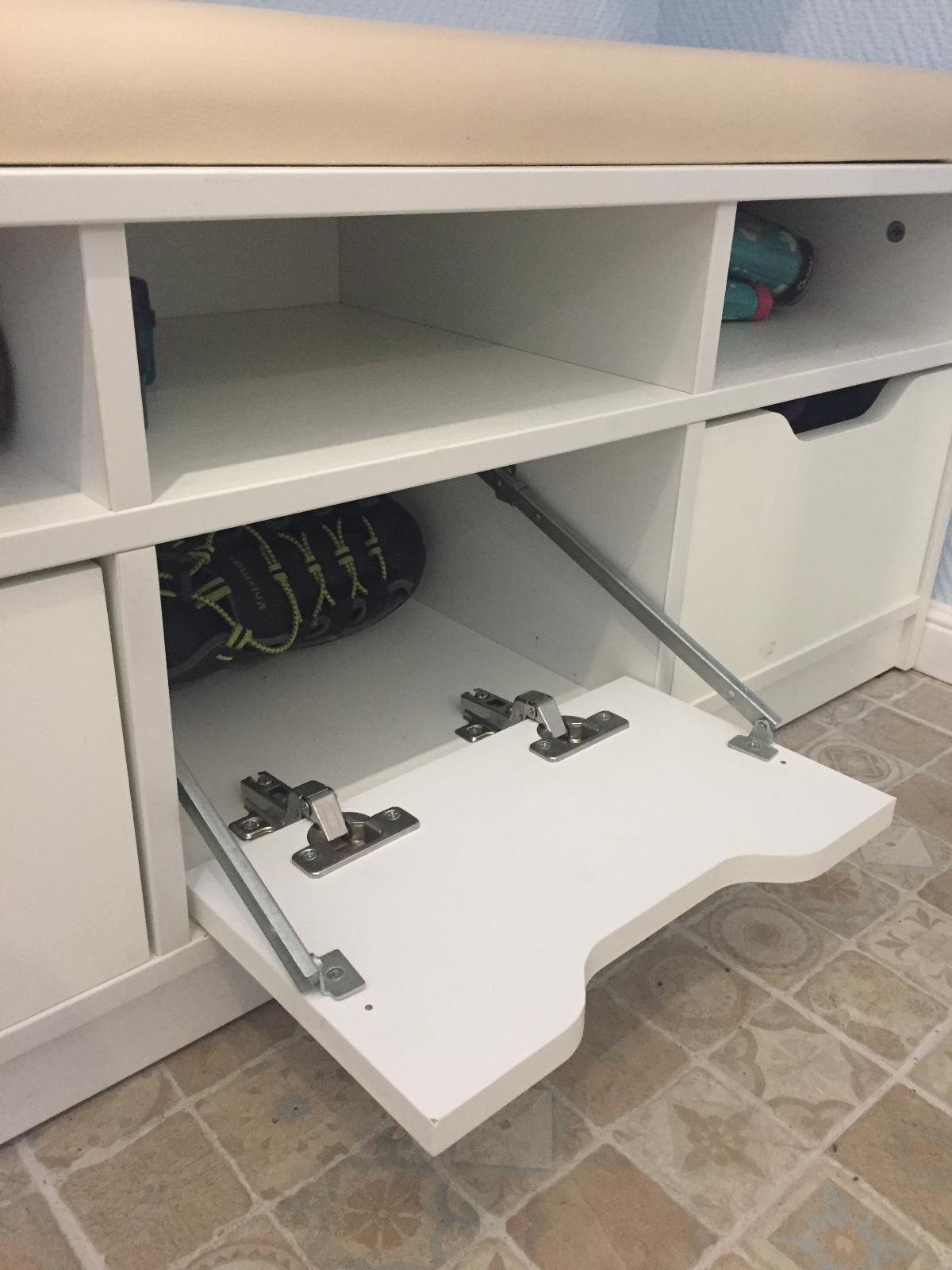 Обувница понравилась. Сделали по нужным размерам, классный конфигуратор на сайте. Качественный лдсп, собирается достаточно просто самостоятельно. Единственное, ящички должны были открываться не до конца, а мне надо было полностью, так что я просто изменила место, куда прикрутить направляющие. Несмотря на небольшой размер, очень вместительная.