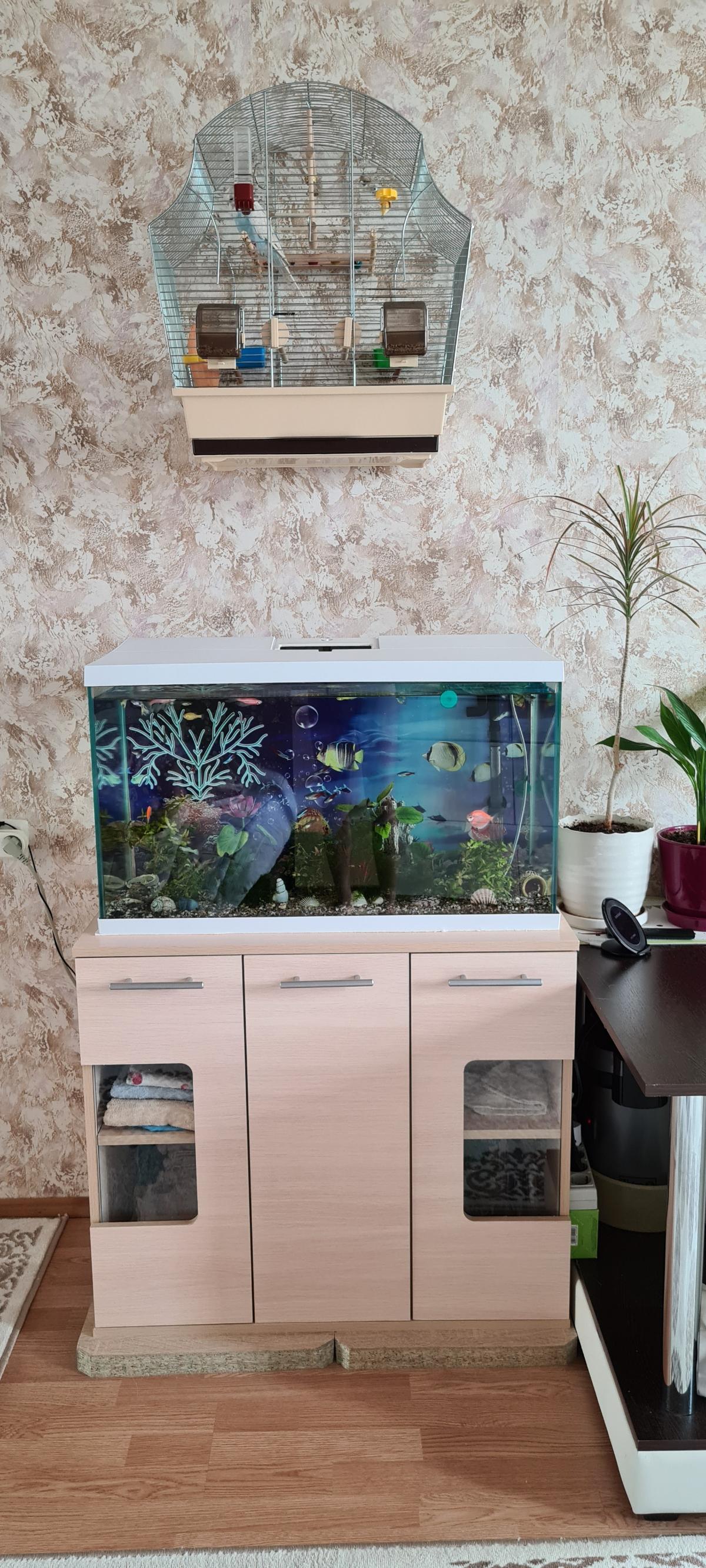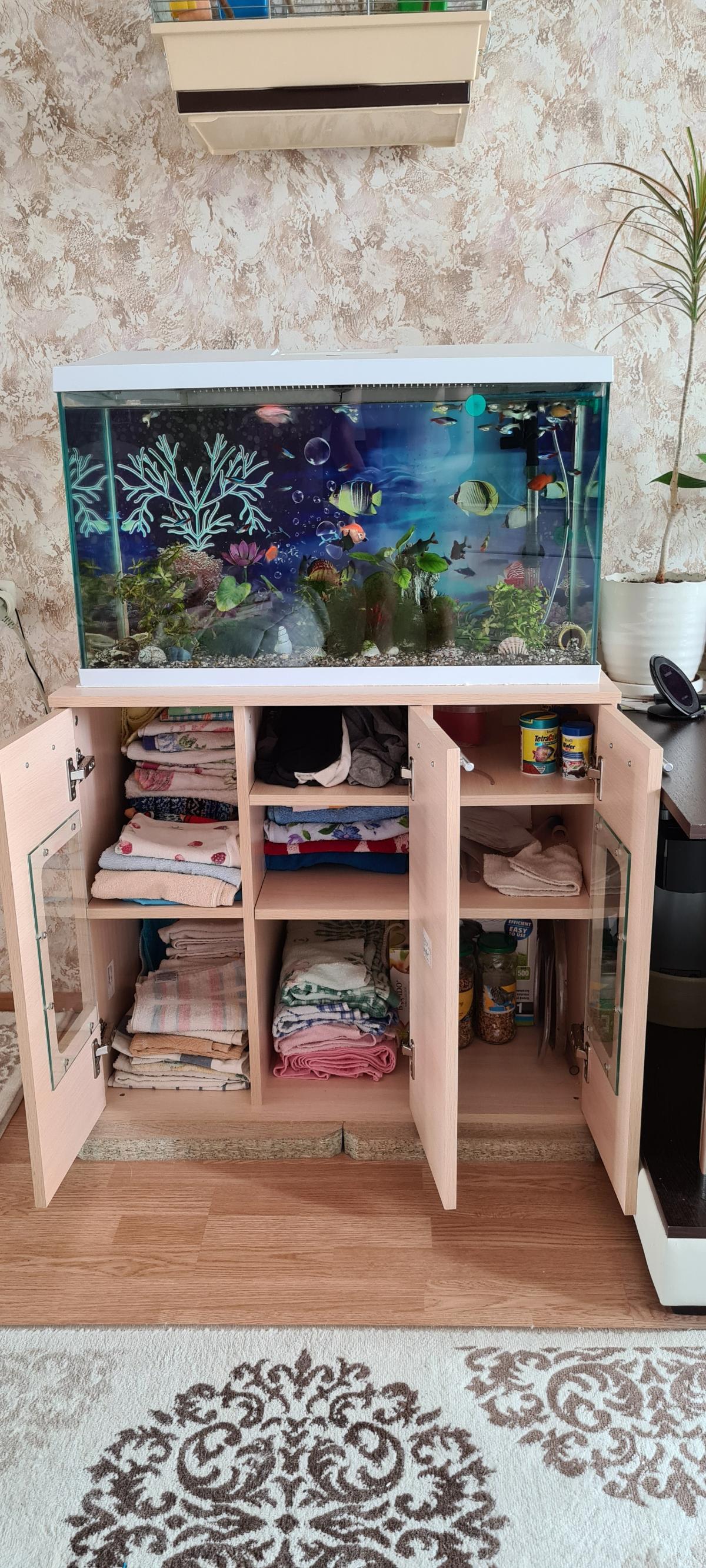 Отличная тумба под аквариум! Выдерживает большой вес.Все вмещается. Петли с доводчиком,вообще удобно. Дверцы не стучат при закрывании.