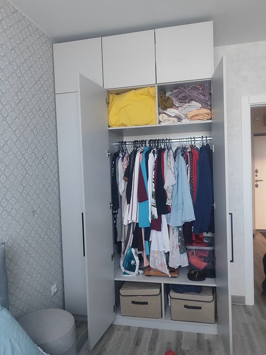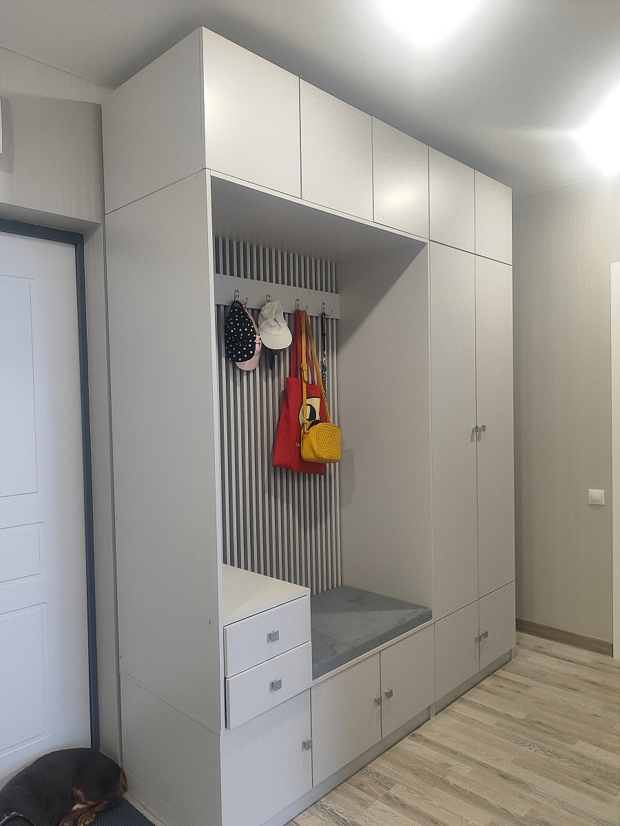 Шкаф порадовал, смотрится солидно. Есть возможность по своему усмотрению изменить конфигурацию: добавили зеркало и дополнительные полки, изменили ручки, изменили размеры. Думали будут проблемы из-за сборки в стеснённых условиях, но мастер за 3 часа все собрал на отлично. Заказ 00000133736