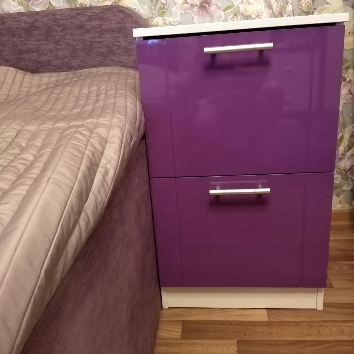 Заказала фиолетовую тумбочку,только на этом сайте,кажется,возможен любой цвет на выбор.Получилась высокая,как и хотела.Собрали сами.