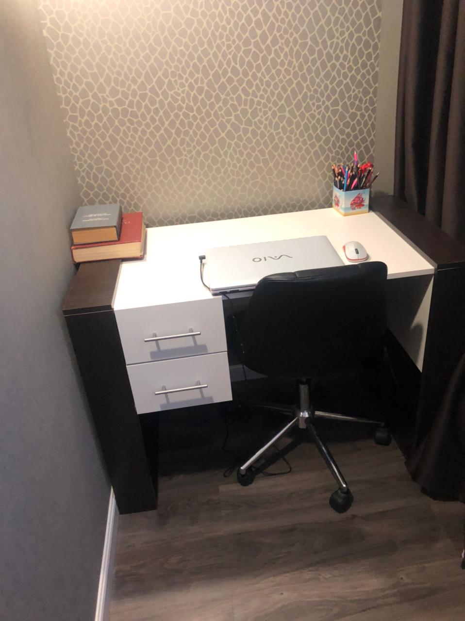 На Новый год сделали себе подарок - заказали этот столик. Удобно, что здесь на сайте можно смоделировать свой, индивидуальный столик, подходящий тебе по цвету и размерам. Решили сделать чуть подлиннее, чем стандартный. Теперь на нем можно одновременно и поработать, и чай попить - места предостаточно. А вечером легким движением руки столик на своих колесиках отправляется спать к стенке. Кстати, очень долго искали такую небольшую модель на колесиках и нигде не могли найти. Спасибо за быстрое и качественное изготовление! Заказ 00000576651, изделие Стол компьютерный Костер 1 BMS (900х750х450).