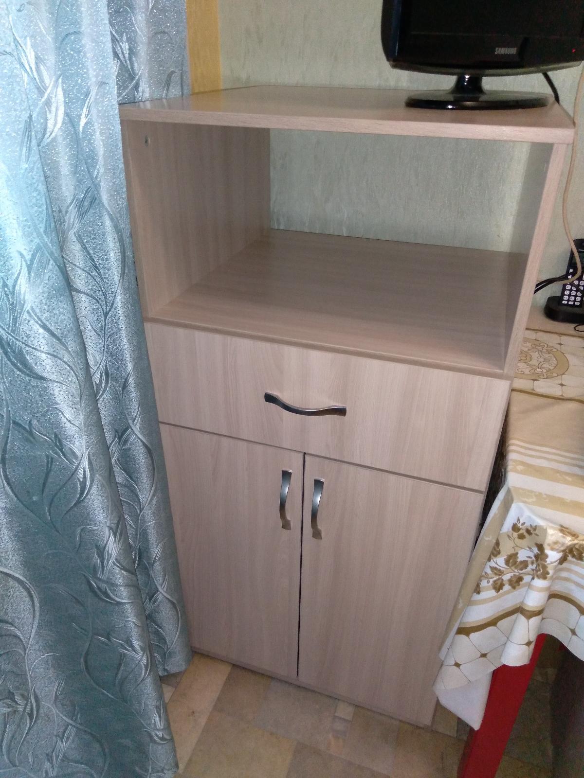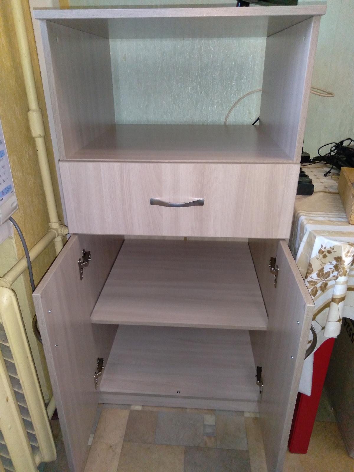 Тумба 60х60, ниша высота 30. Цвет ясень шимо светлый. Ручки вроде металл, надеюсь, не будут отрываться, как пластиковые. Единственное, одна дверца чуть ниже получилась, не знаю, как ее подтянуть, похоже, так были отверстия просверлены под петли. Дно выдвижного ящика хлипковатое - фанерка, такая же, как по задней стенке. В целом довольны.