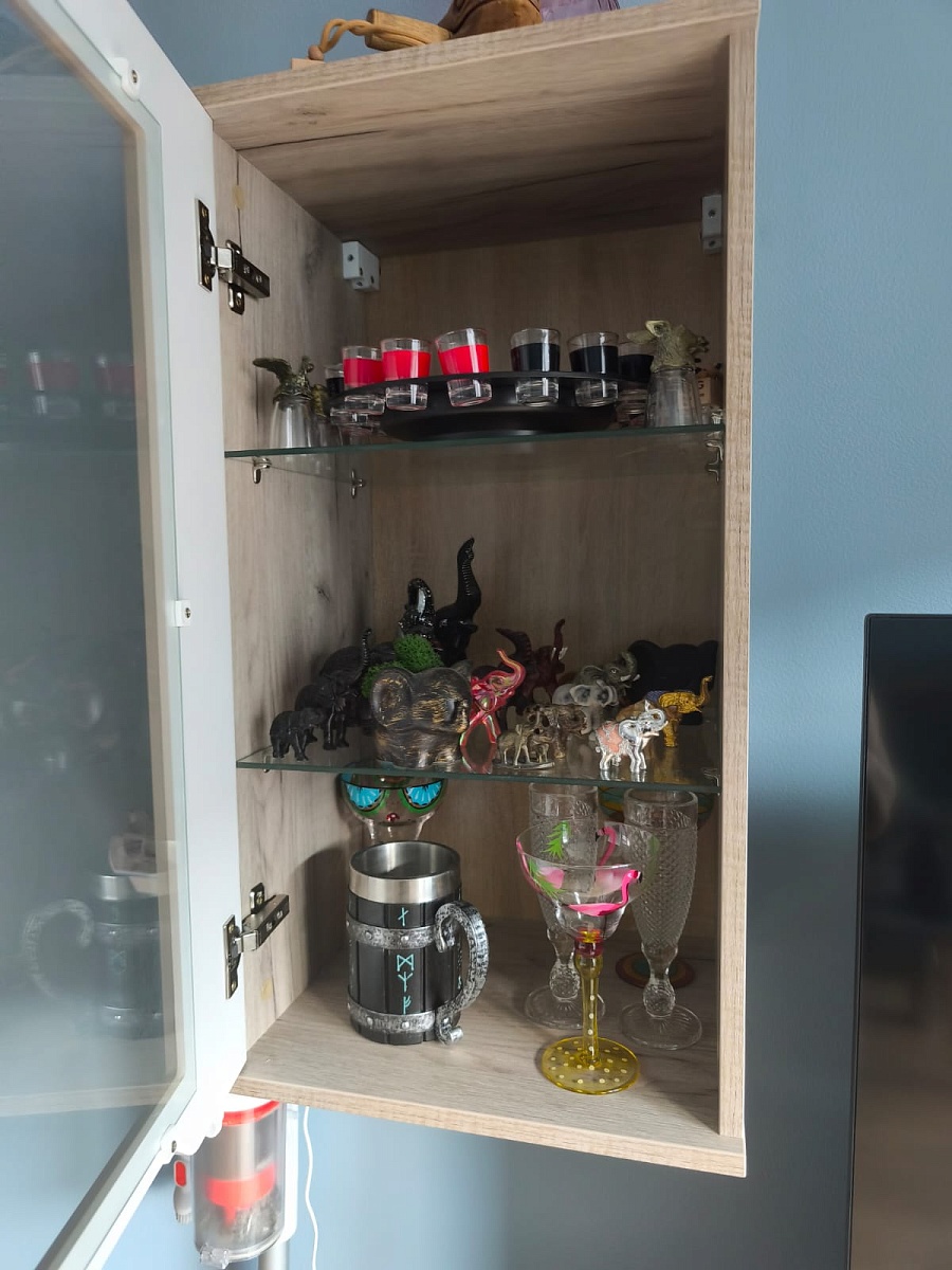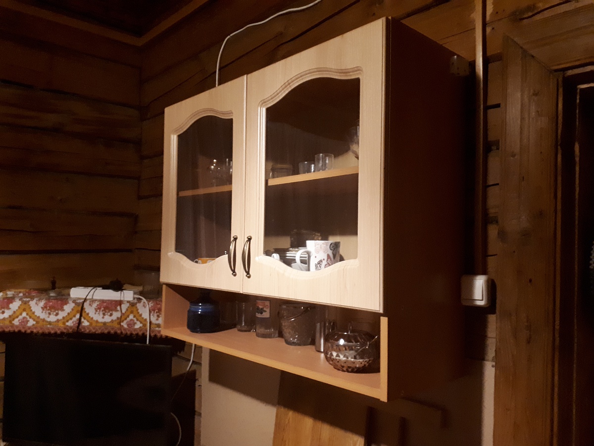Шкаф отлично украсил интерьер столовой комнаты на даче! Со сборкой особых проблем не возникло, лишь длина перекладины для крепления оказалась меньше нужной и пришлось ее распилить и вешать по частям с зазором 4 см.