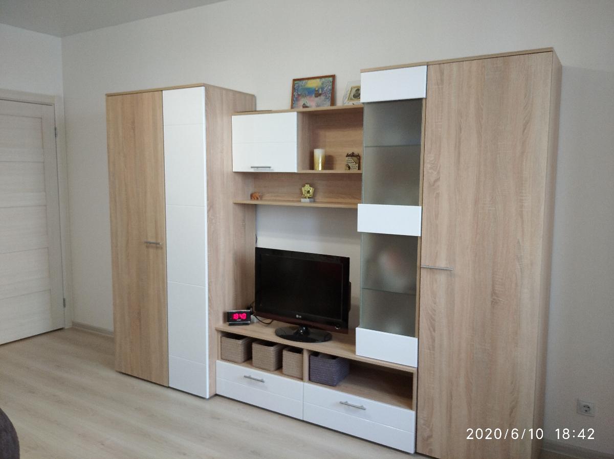 Шкаф нас удивил. Он оказался длинным и тонким (НЕ таким широким и коротким как на ваших картинках). Матового стекла в нем тоже нет. Он весь деревянный (или что там за материал). Мы думали хранить в нем папки, но они, конечно же, НЕ везли. В итоге мы приспособили его под детские вещи и, в целом, довольны. Смотрится стильно, как видите на фото (сверху лежит рамочка, не обращайте внимания). Убираться очень удобно, когда мебель висит. Благодаря вашей компании столы у нас тоже навесные и мы счастливы)