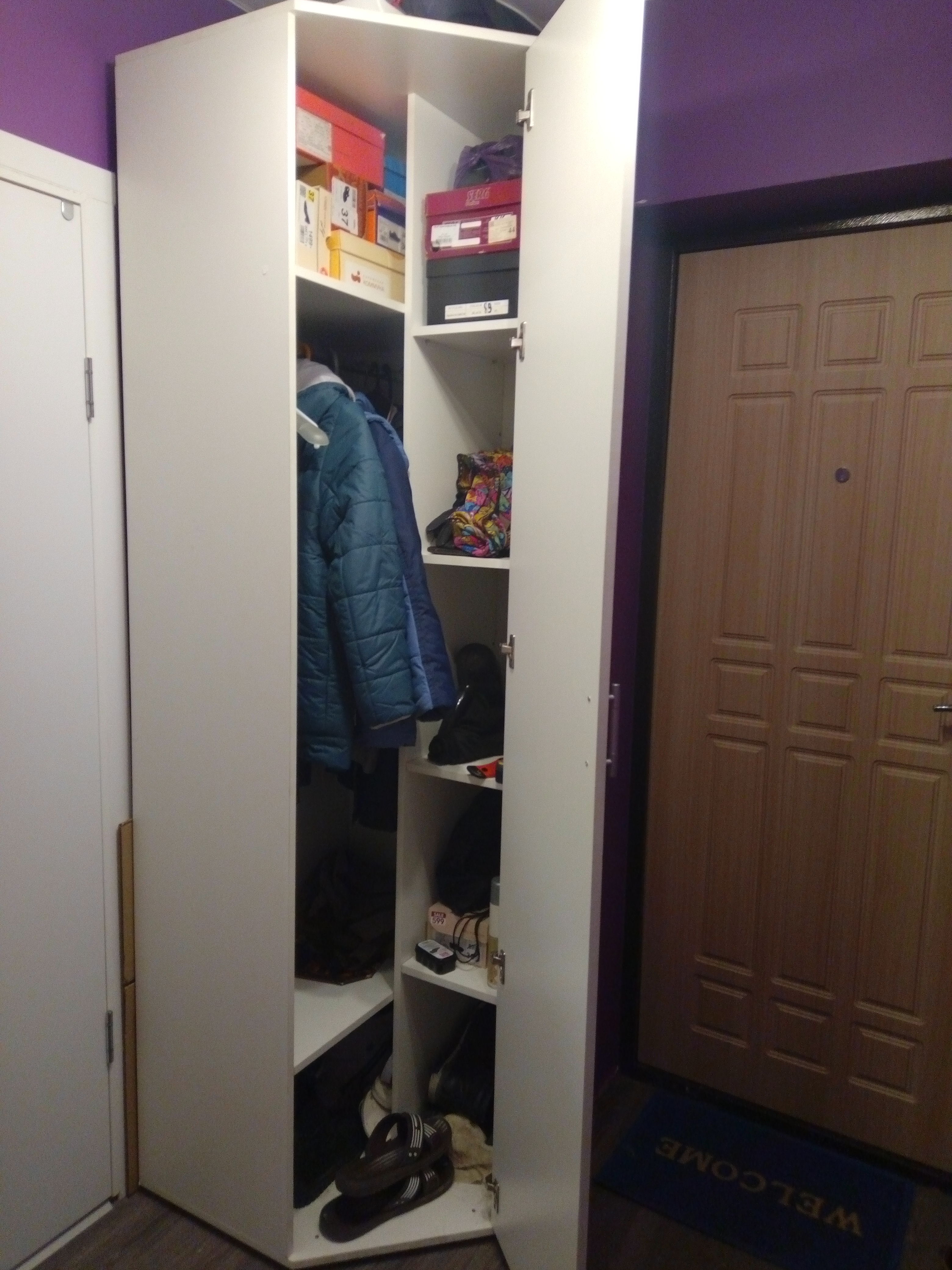 В нашей квартире очень маленький коридор, а двери, входная и в ванную, расположены так, что угловое расстояние - не более 70 см. Найти угловой шкаф с такими размерами - задача не из лёгких, но BestMebelShop как всегда оказался на высоте! Во-первых шкаф идеально подошёл в размеры коридора, во-вторых сам шкаф оказался очень достойного качества! Ну а в третьих работа магазина доставила массу положительных эмоций: всё в срок, всё без брака, доставка ко времени.Отдельно хочу выразить благодарность службе сервиса! Сейчас решил добавить полок в шкаф, позвонил в сервисный центр и без проблем оформи через них дозаказ на 4 полочки по очень гуманной цене!В общем искренне рекомендую, как сам шкаф, так и магазин в целом.